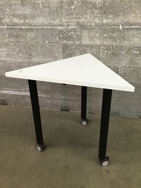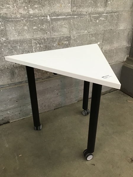 Rolling triangular cafe table purported be a Steelcase but we couldn't find a maker's mark. Feels like good quality. Legs could be harvest to use with a different top.