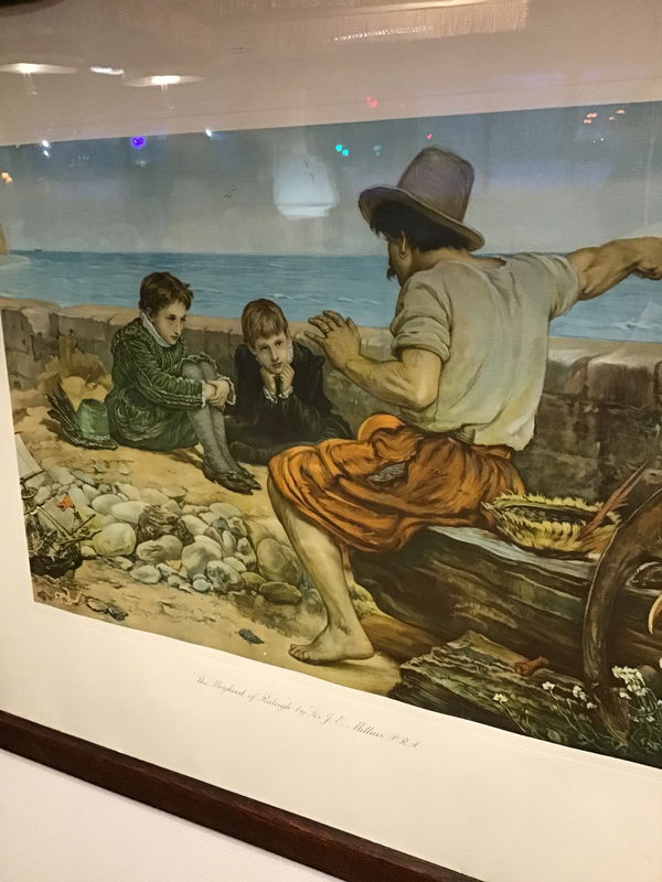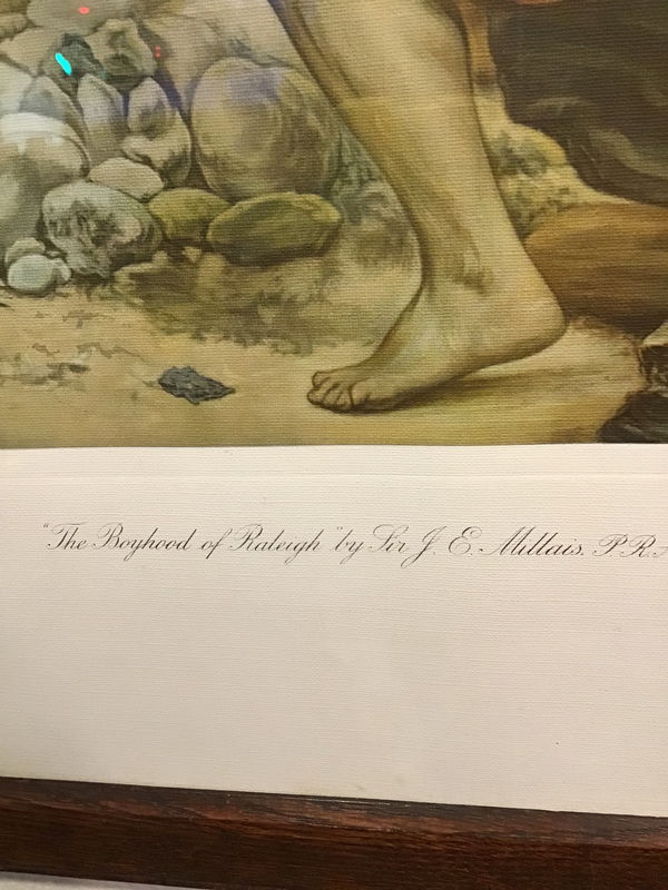 Lovely print of John Everett Millais' painting "The Boyhood of Raleigh." Which depicts famed explorer Sir Walter Raleigh and his brother listening intently to a sailor's stories of sea. Nice print on canvas and in a solid wood frame.