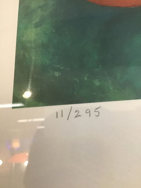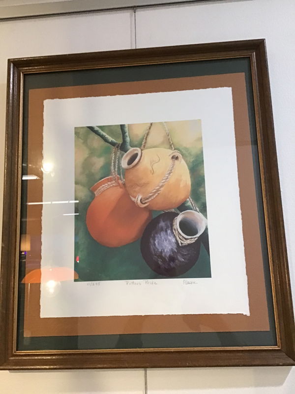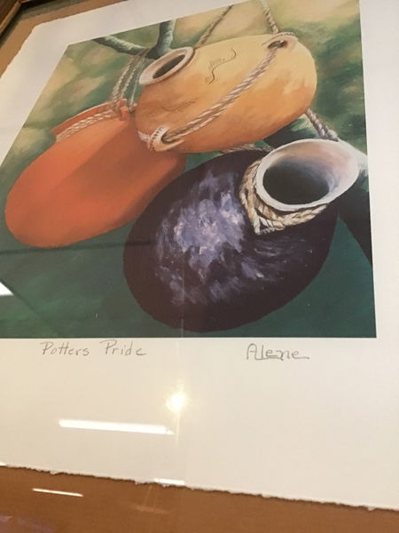 Limited print titled "Potters Pride." Painted by local Seattle artist Alene Rucker, its a limited print with this one numbered 11/295. Print on canvas showing 3 pots in primary colors hanging from a branch. Framed really nicely with the canvas on a brown background, and a simple wood frame.