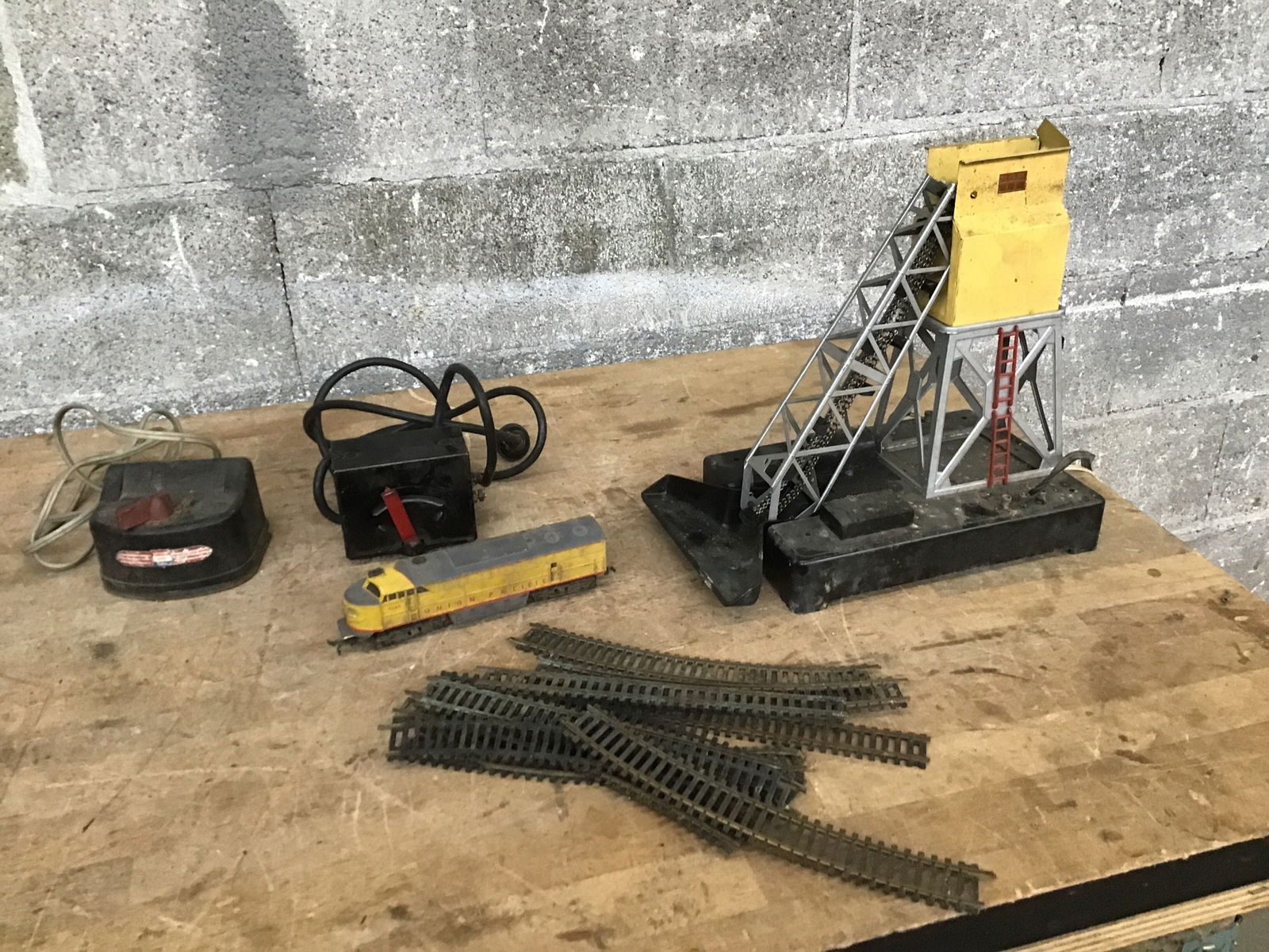 Model train stuff that includes one engine. two transformers, a bunch of tracks and a super cool coal elevator.