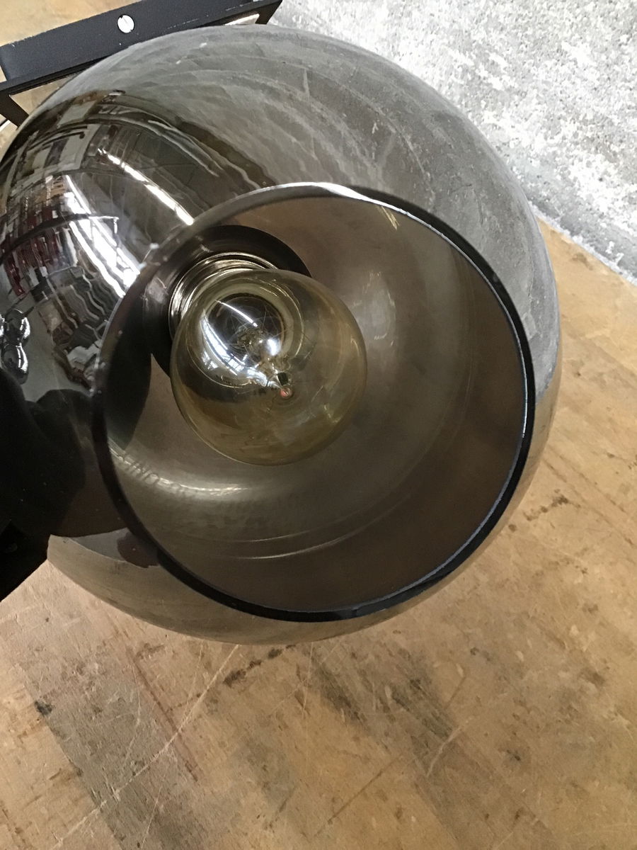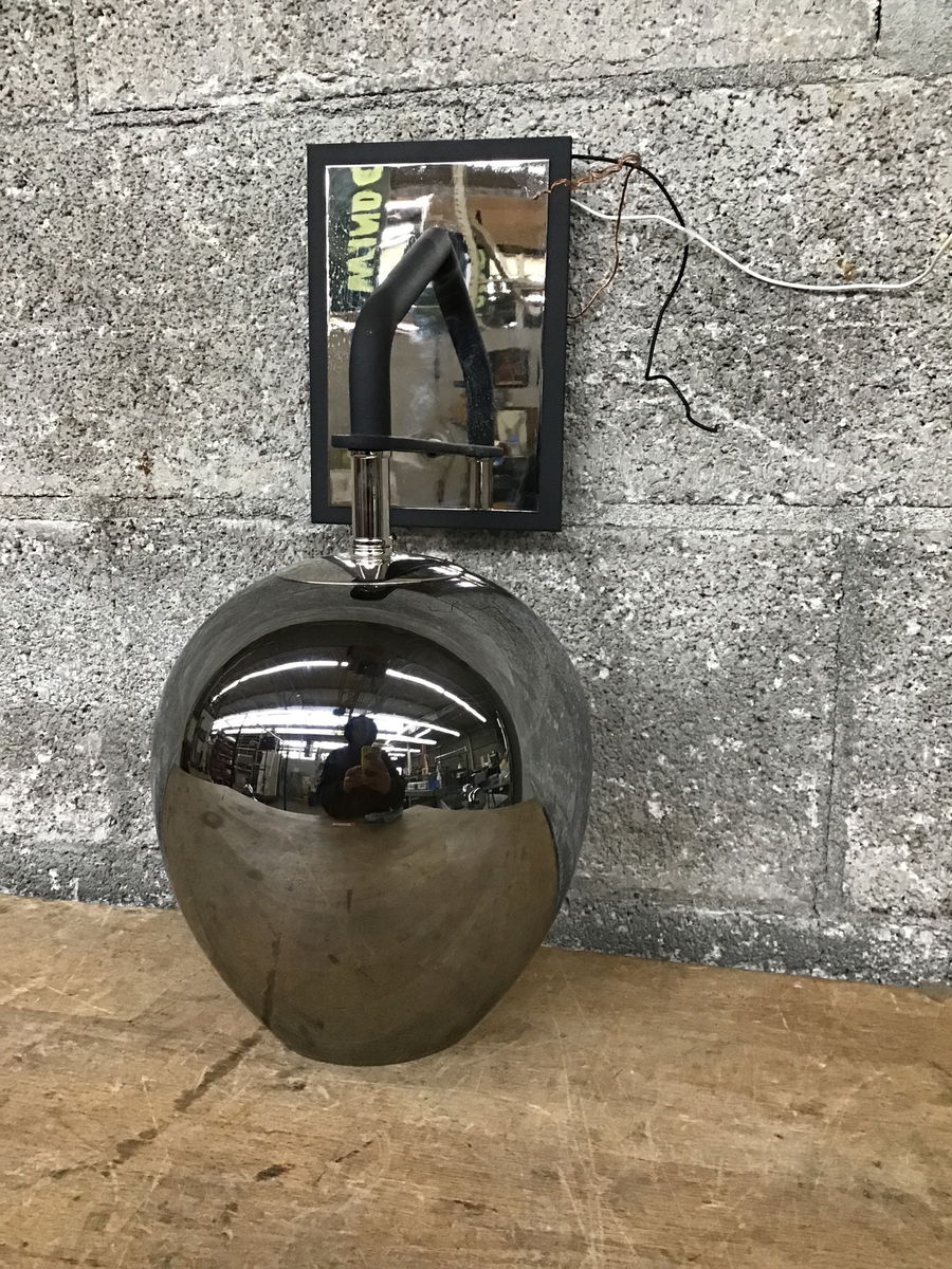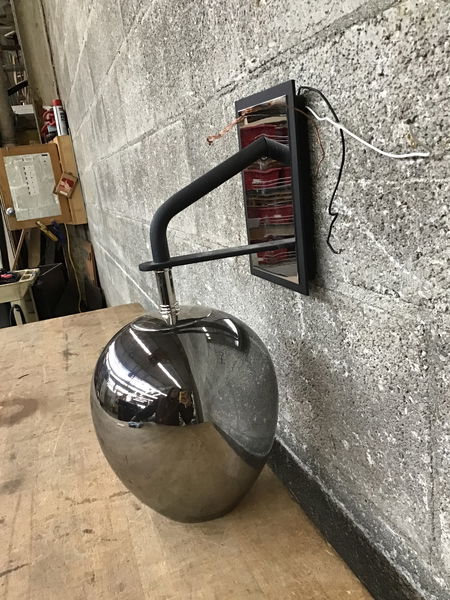 Made by Troy Lighting, this wall sconce features a matte black steel fitter with mirrored back and a polished glass shade that appears reflective until illuminated. Full product specs available here.