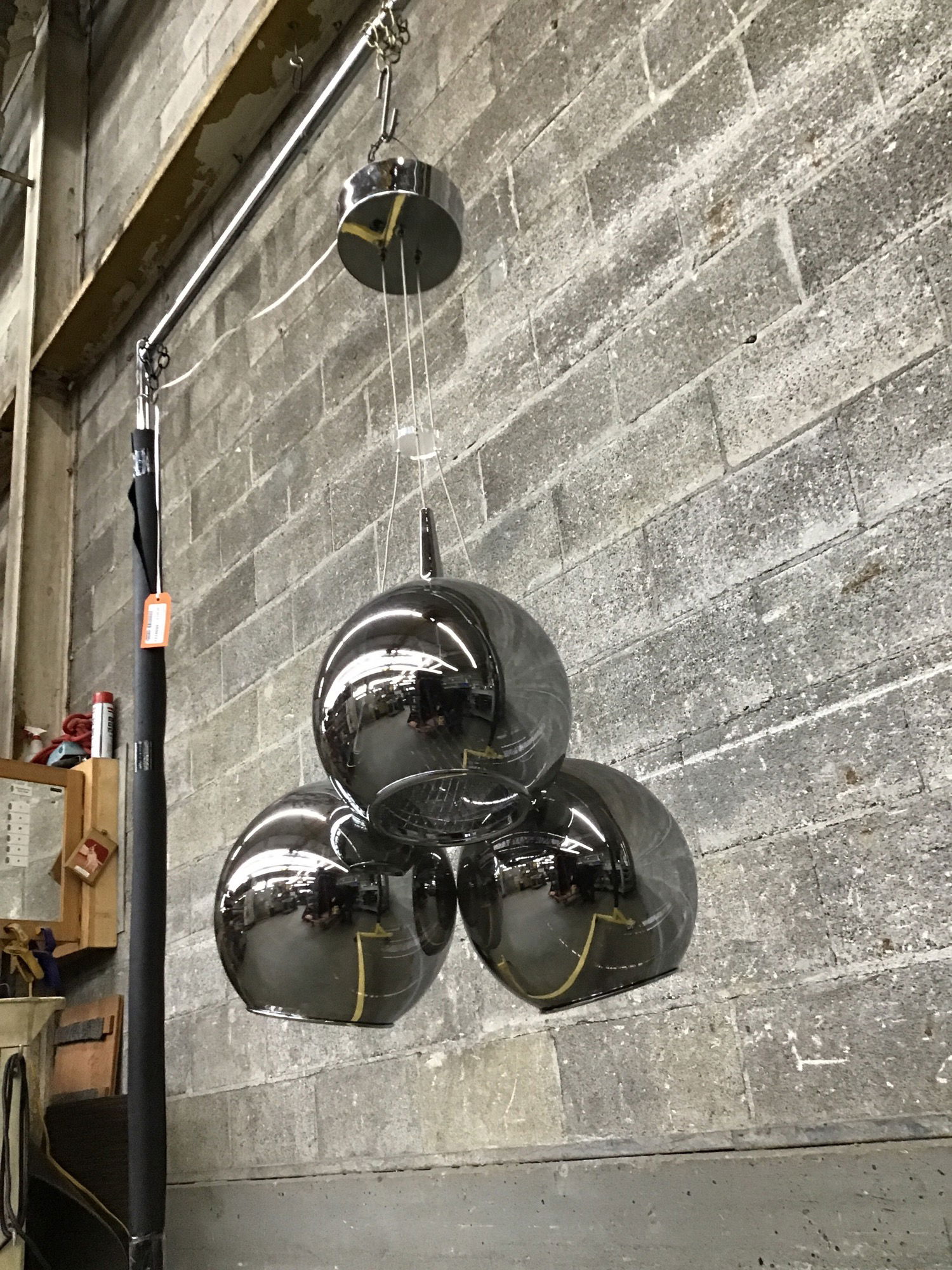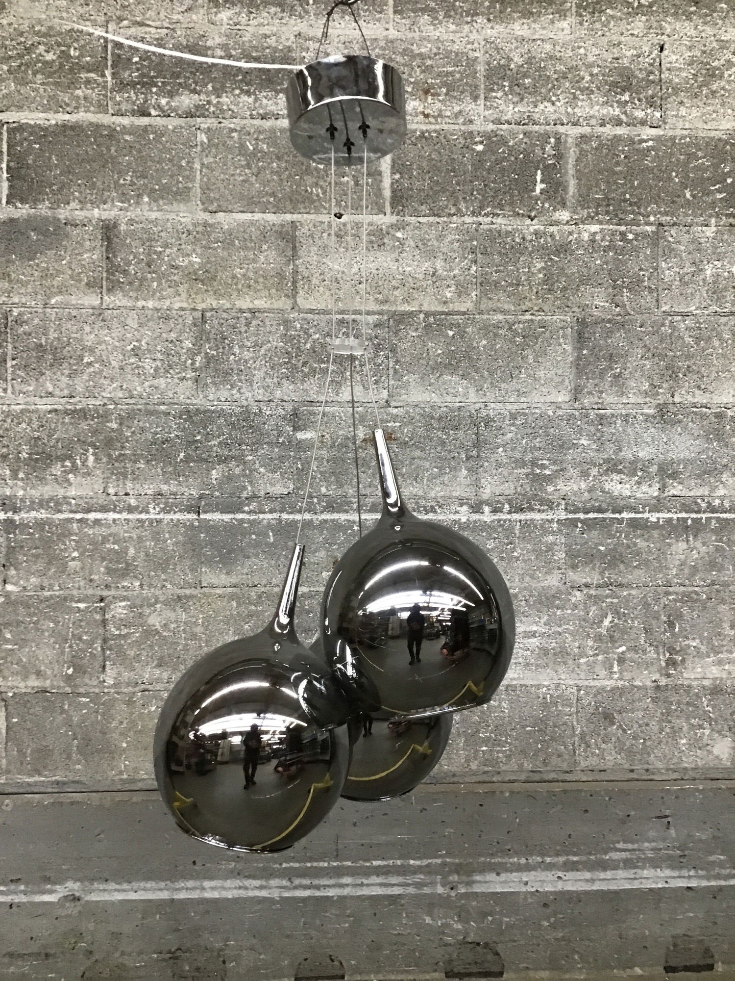 Three "bulb" LED hanging light that features really neat shades that appear reflective, but are smoky translucent once illuminated.