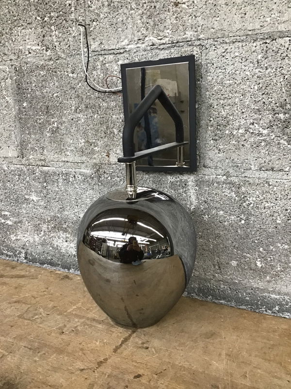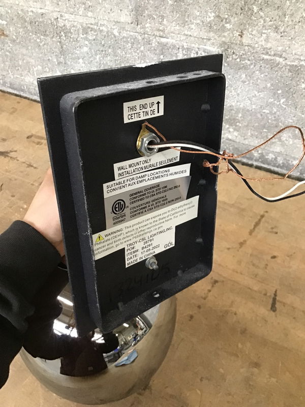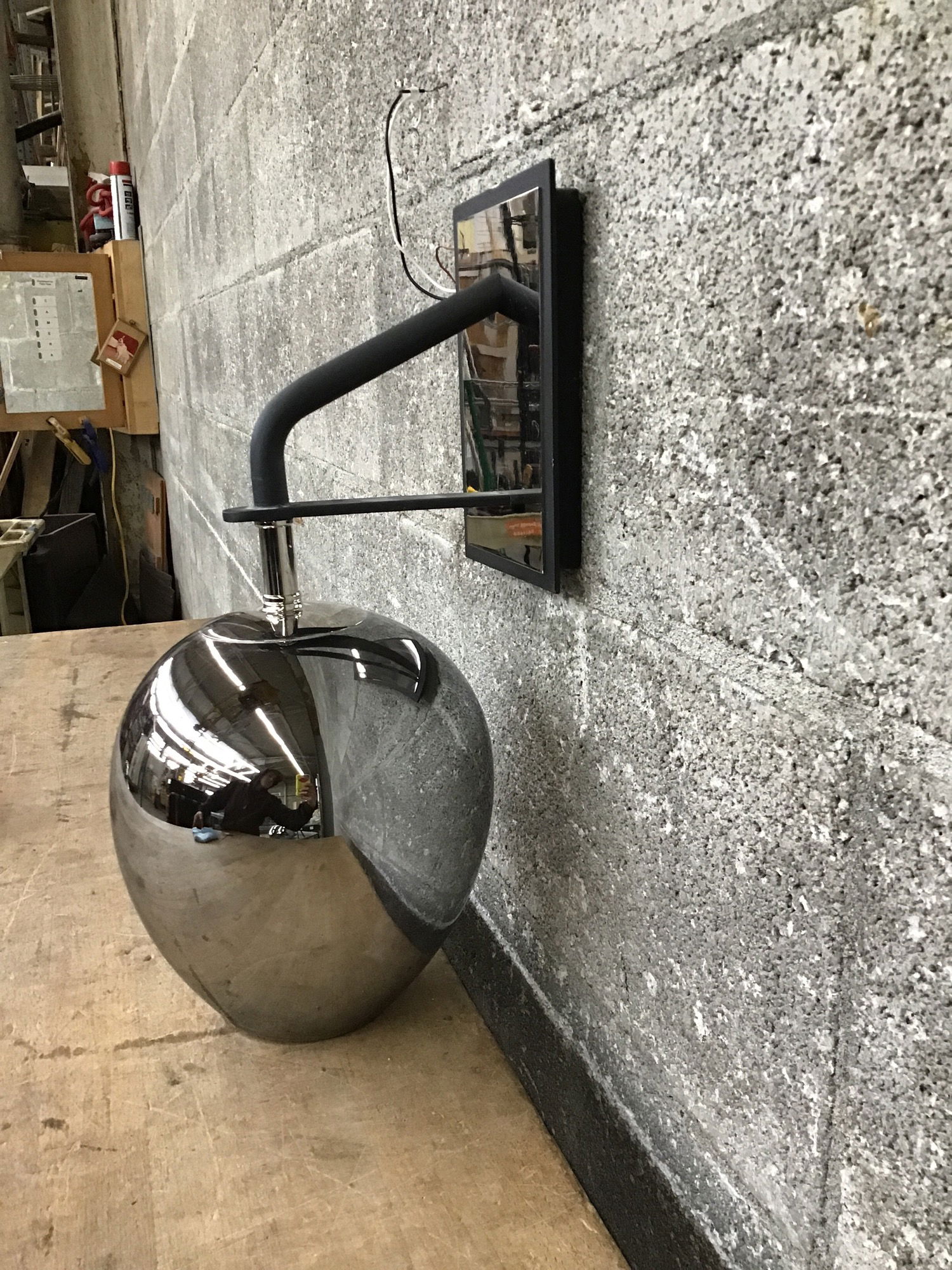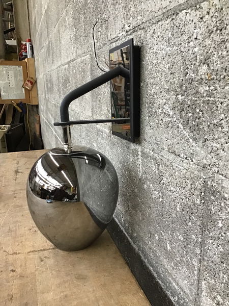 Made by Troy Lighting, this wall sconce features a matte black steel fitter with mirrored back and a polished glass shade that appears reflective until illuminated. Full product specs available here. Price reflects a specific mounting bracket that is missing. I'm sure you could find an adjustable/universal style replacement online but we're fresh out here in our lighting shop!