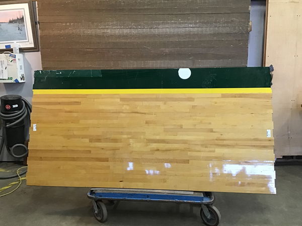 Maple wood basketball court flooring salvaged from a local middle school. Is currently sitting on a sturdy oriented strand board but has NO STRINGERS. Varnished with a yellow stripe and forest green. Ready for your project!