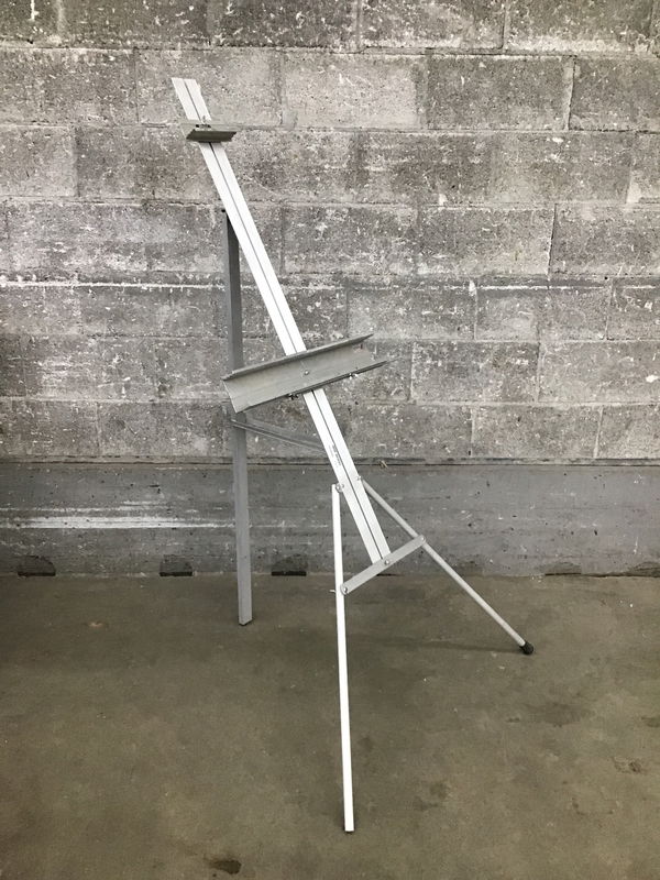 A solid metal fold up display easel that is very light yet sturdy.