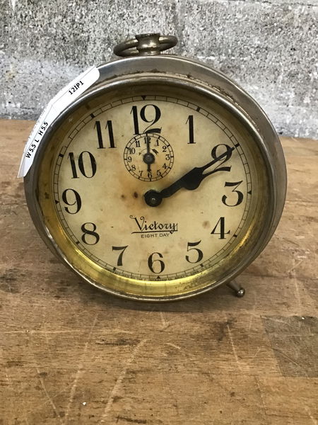 Vintage Victory brand eight day alarm clock. I hear it ticking but the hands don't seem to be moving. Still a cool decor piece or source of parts.