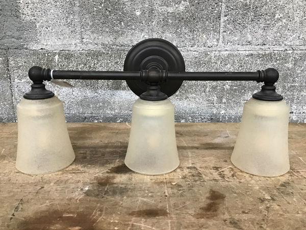 3-bulb vanity bar with three frosted glass shades and sturdy hardware with an oiled bronze finish.