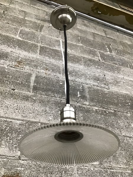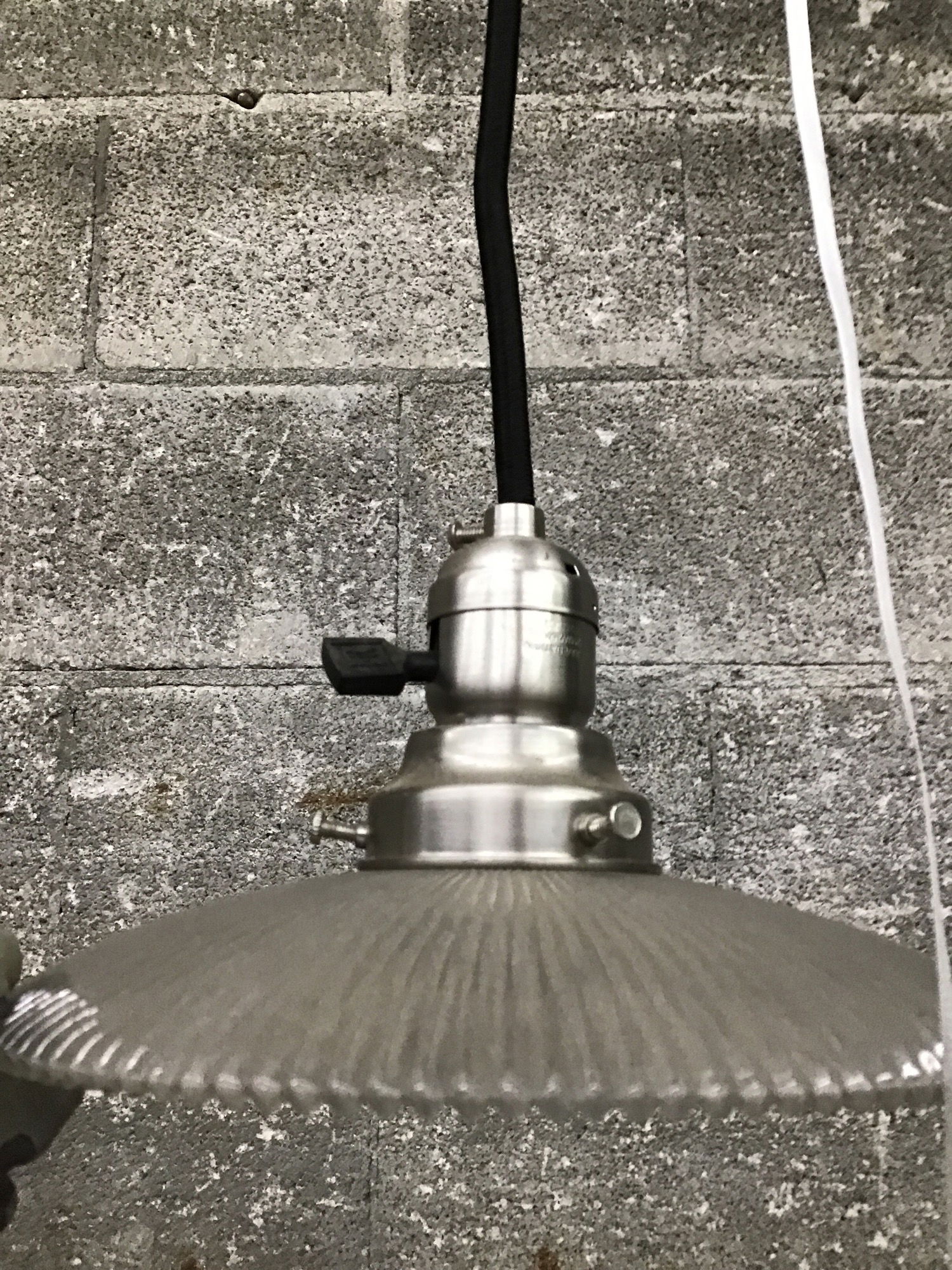 A pair of Rejuvenation pendants circa 2013 that we've fitted with some killer vintage holophane shades! Each light has a thumb turn switch, so they could easily serve as bedside lamps! We think these strike the perfect balance of industrial and elegant with decorative black wire housing, brushed nickel finish, and of course the shimmery vintage shades. One will need a new mounting bracket, but our staff can help you find one that fits just right!