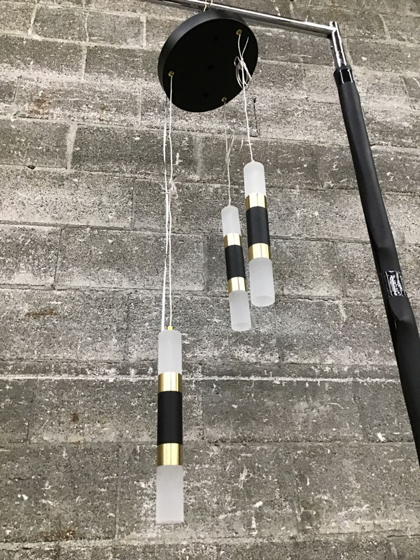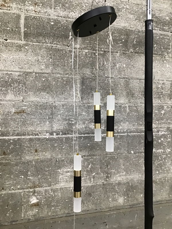 Modern pendant light fixture with black and brass accents. Each individual pendant can be shortened. Includes install guide