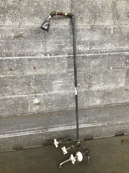 This clawfoot tub faucet and shower riser looks a little rougher and rowdier than something you probably want in your bathroom, BUT it does have great potential to be the faucet for an outdoor shower or, if you swap the shower riser for just a hand shower, a fantastic faucet set up for a dog wash. Heck, you could even make it into some cool backyard art. Eclectic fenceline fountain anyone???