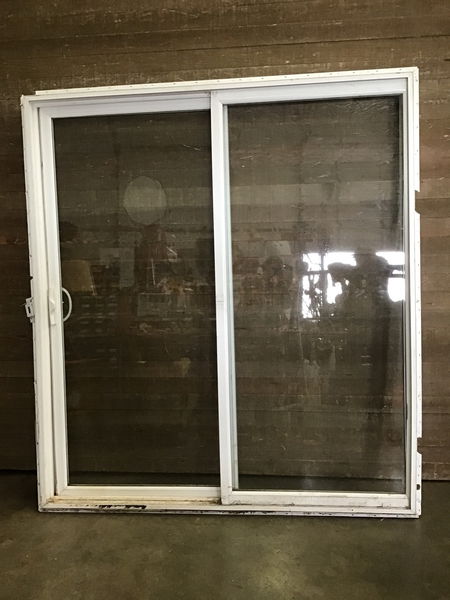 Exterior white vinyl sliding door. Seals look good and includes nailing fins, and the latch catch is included.