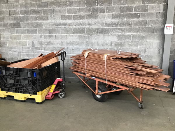 This is a lot of roughly 850SF of Brazilian Cherry or "Jatoba" hardwood flooring with a width of 5.5". Pieces range from 30"-80". This stuff is prefinished and the surface looks pretty good. This flooring was manufactured in 2019.