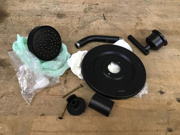 A shower trim kit by Moen, part of their Gibson line, in a matte black finish, sporting the handle, valve trim, spout, and showerhead. Retails new for about $100.