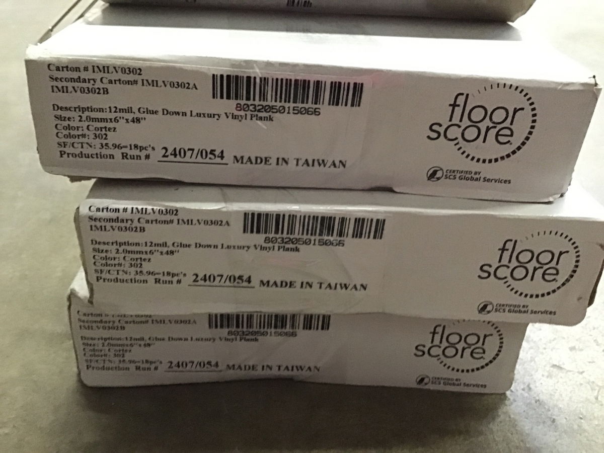 Four new boxes of glue down luxury vinyl plank flooring in the color "Cortez" by Floor Score. There are three complete boxes of 6"x48" planks and one partial box for a total of 71 planks and 142 Square feet.