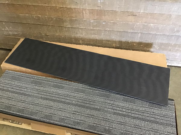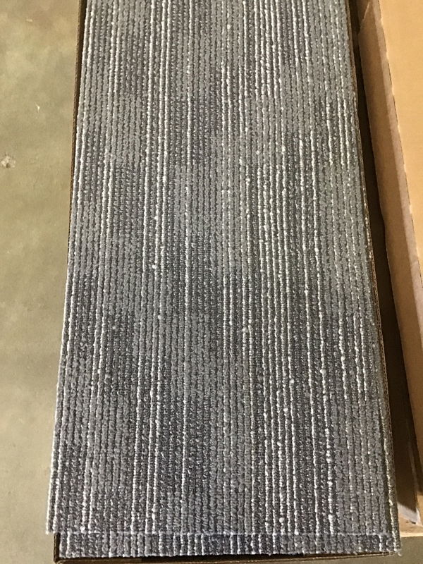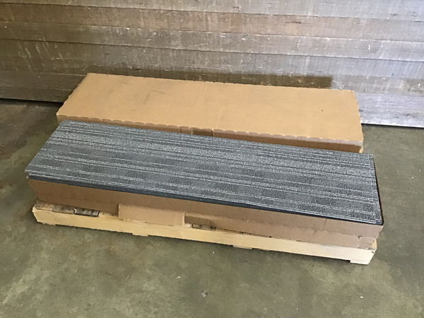 Four new boxes of grey scale carpet tile, color name "Crosscourt". Each box has 18 pieces measuring 12" x 48" for a total of 72 pieces and a total of 288 square feet.
