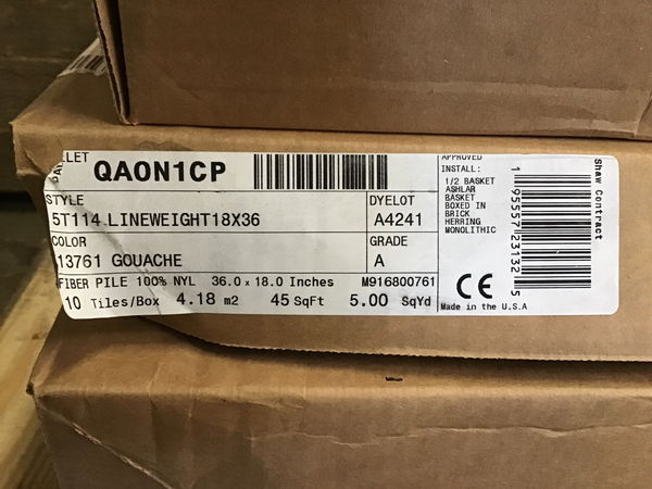 Five new boxes of grey scale carpet tile, color name "Gouache". Four boxes have 10 pieces and one partial box with 9 pieces measuring 18" x 36" for a total of 49 pieces and a total of 220.5 square feet.