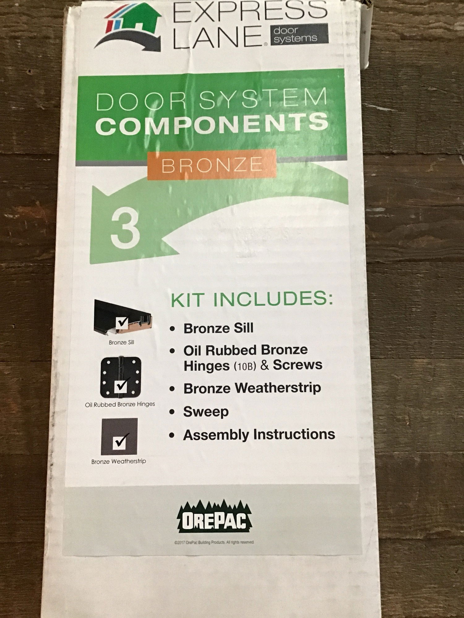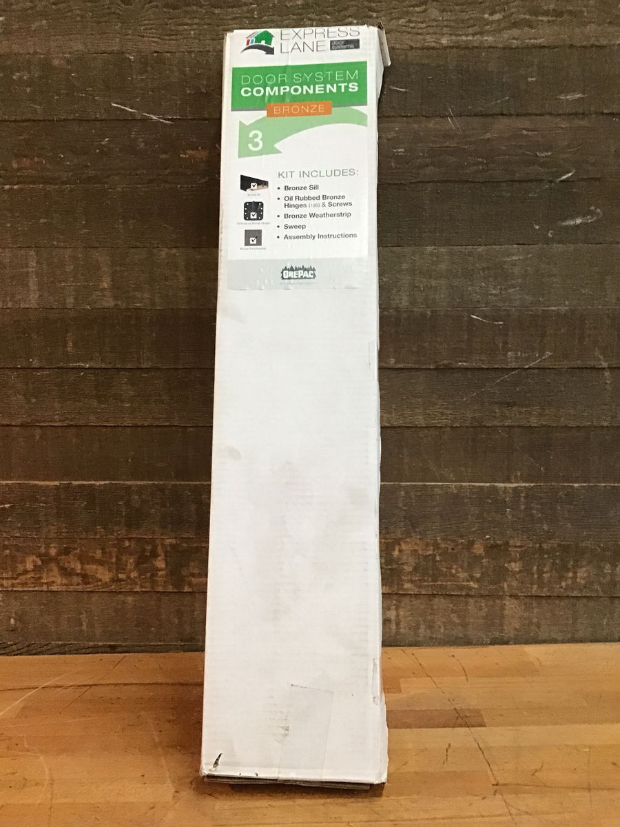 New in box, door system components kit with a oil rubbed bronze finish. This fits 6.5" jamb size doors. Kit includes: mill sill, oil rubbed bronze hinges & screws, brown weather-strip, sweep, and assembly instructions. Photo may be representational.