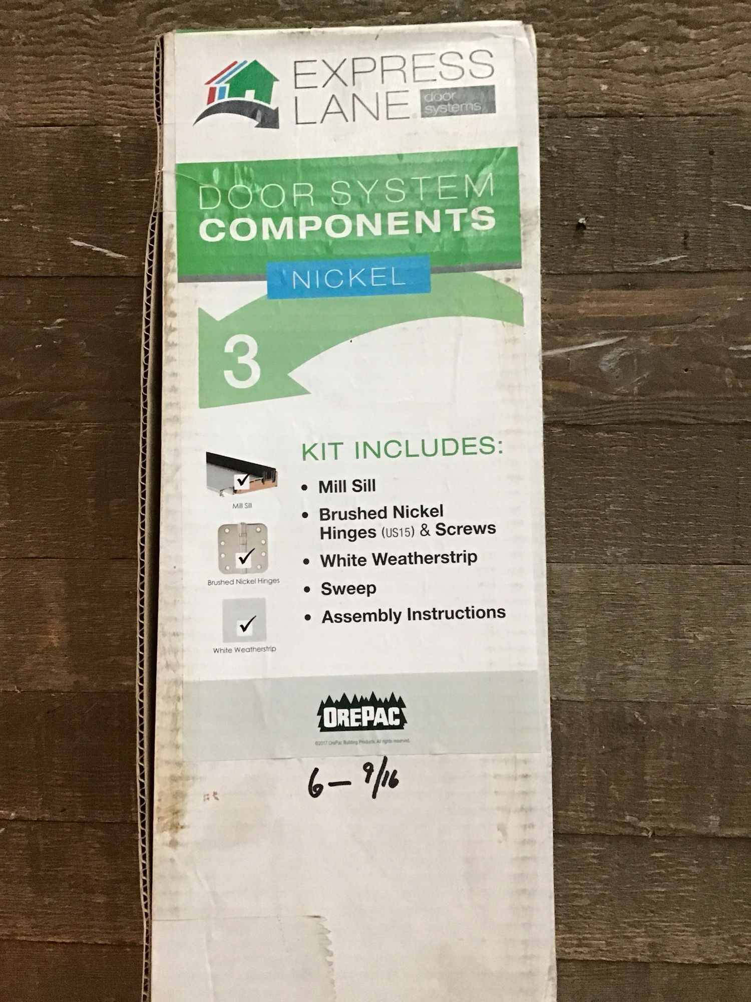 New in box, door system components kit with a brushed nickel finish. This fits 6.5" jamb size doors. Kit includes: mill sill, oil brushed nickel hinges & screws, white weather-strip, sweep, and assembly instructions. Photo may be representational.