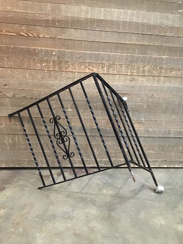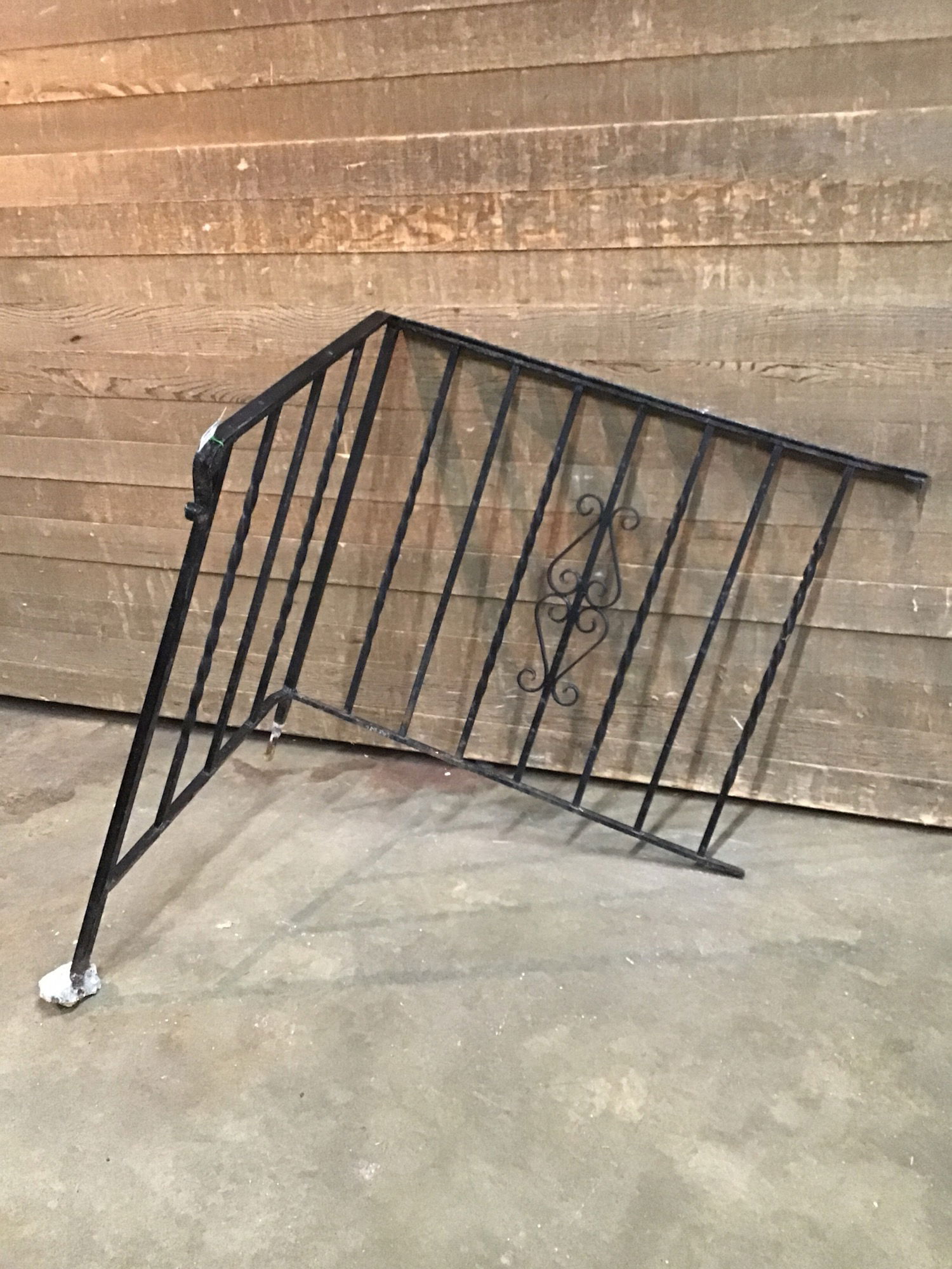 Wrought iron railing corner section. Previously installed. Has a 90 degree turn creating a short left hand sloped railing. I don't believe this would be good for use in a code compliant situation, but would make a nice corner piece of yard/garden art/decor.