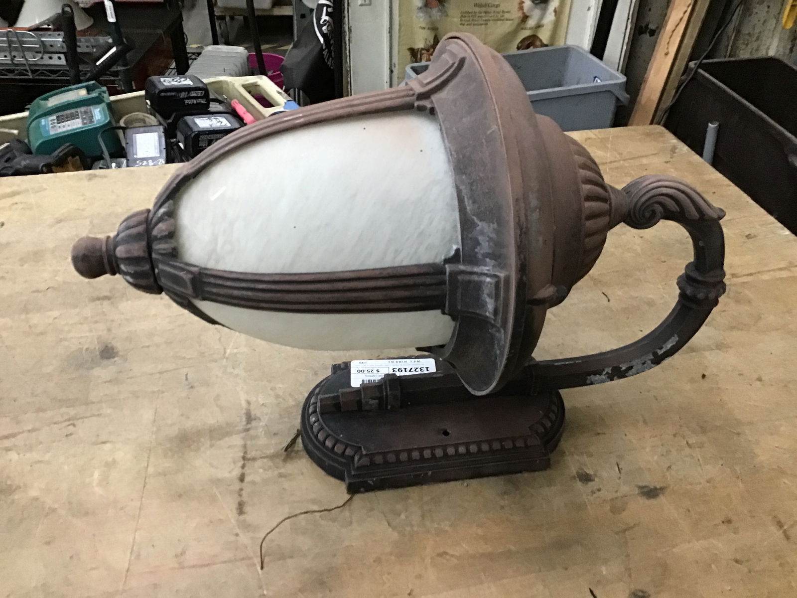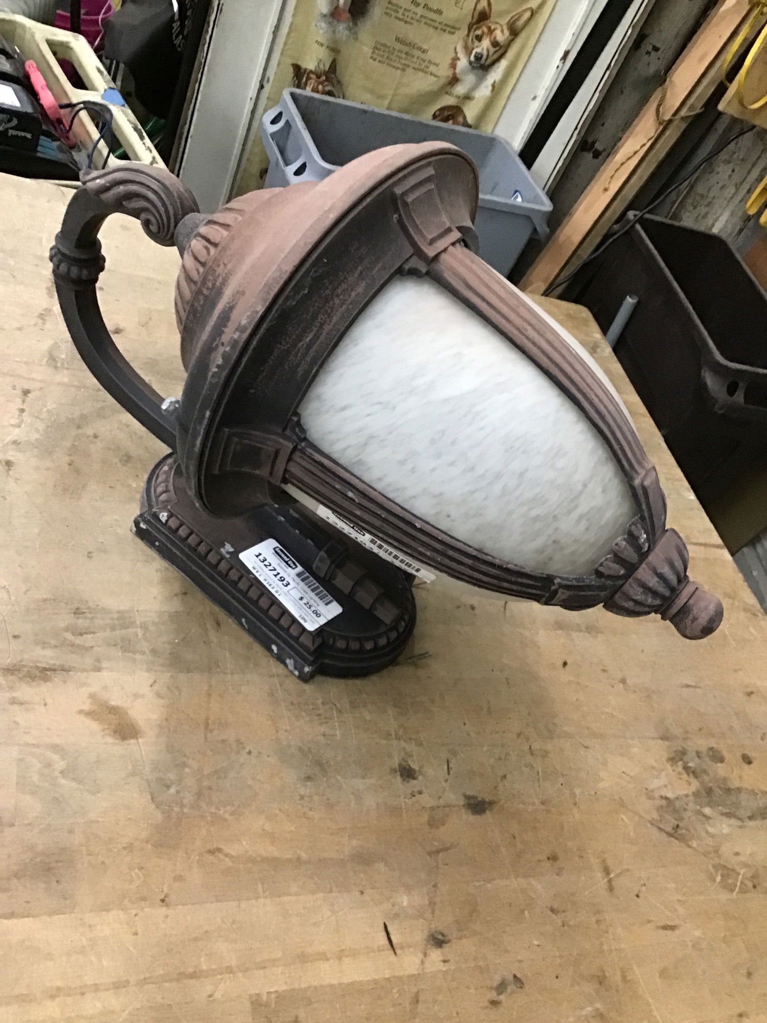 An outdoor sconce by Pacific Coast Lighting with a semi opaque frosted shade and a rustic rusty brown color to the frame. Suitable for wet locaitons. This would make a handsome front door sconce.