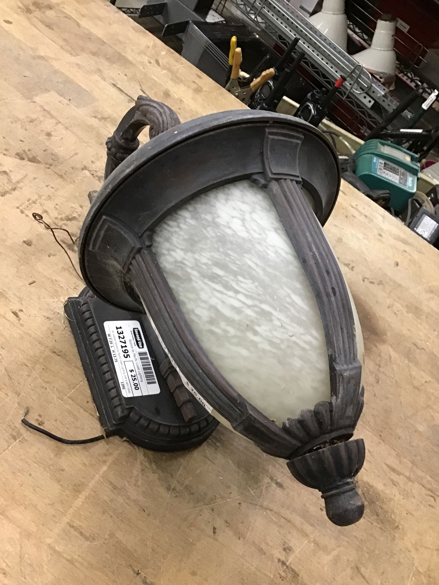An outdoor sconce by Pacific Coast Lighting with a semi opaque frosted shade and a rustic rusty umber color to the frame. Suitable for wet locaitons. This would make a handsome front door sconce.