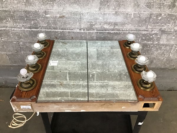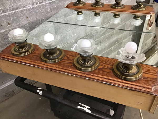 Here we have a very bold oak medicine cabinet with two full mirrored doors, and a total of 8 lights each with semi opaque flowery glass shades. Some of the shades are broken, but the organic nature of the shade shape does well to conceal this. Includes glass repositionable shelves.
