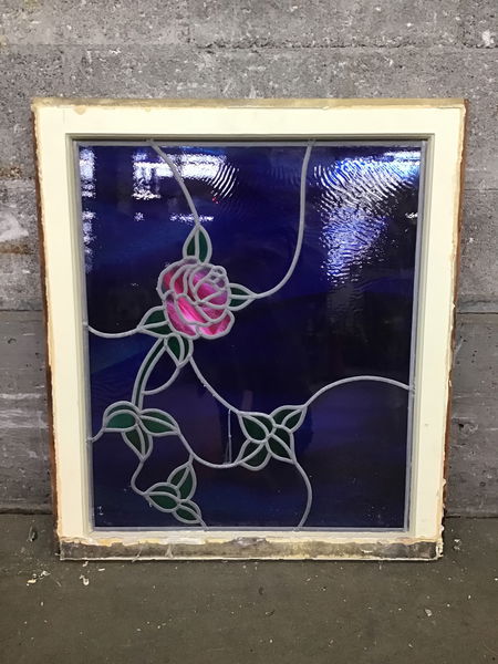 This is a panel of stained glass that depicts a colorful rose on a deep blue background. Framed in fir.