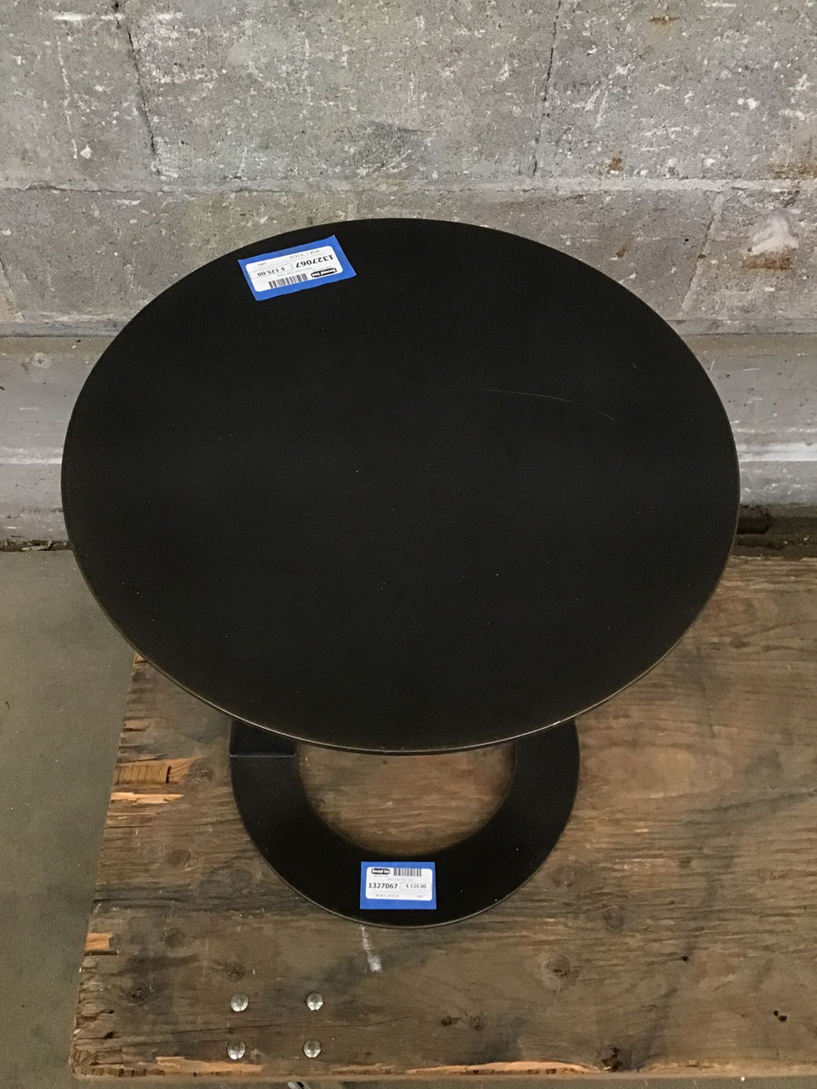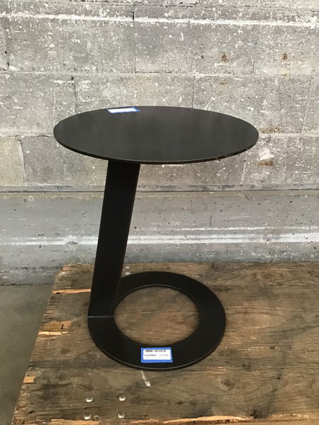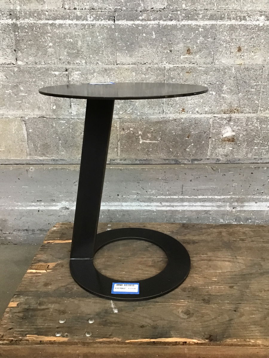 Custom built side table constructed of heavy steel. Shows some cosmetic wear from use.