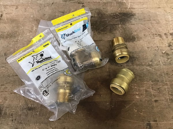 Four Sharkbite push to connect fittings for for 1" pipe. There's a 1" x 1" elbow, two 1" x 1" MNPT couplings, and one 1" x 1" FNPT coupling.