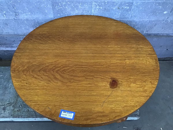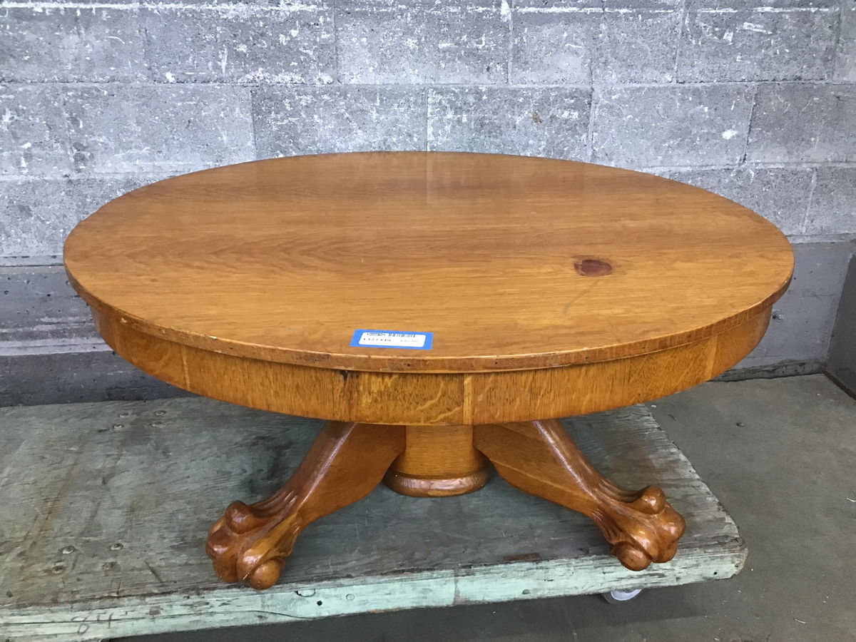 Low oak table with sturdy base and claw-like feet. Once had leaves and could be adjusted, but seems it came to us without them. Overall beautiful grain and finish that make this table a stunner as-is.