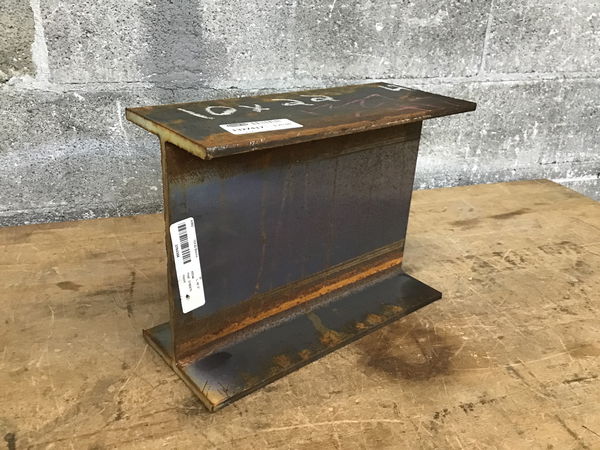 Steel I beam with 5/16" thick center and 7/16" thick top & bottom plate. It's about the perfect size to make a light duty anvil.