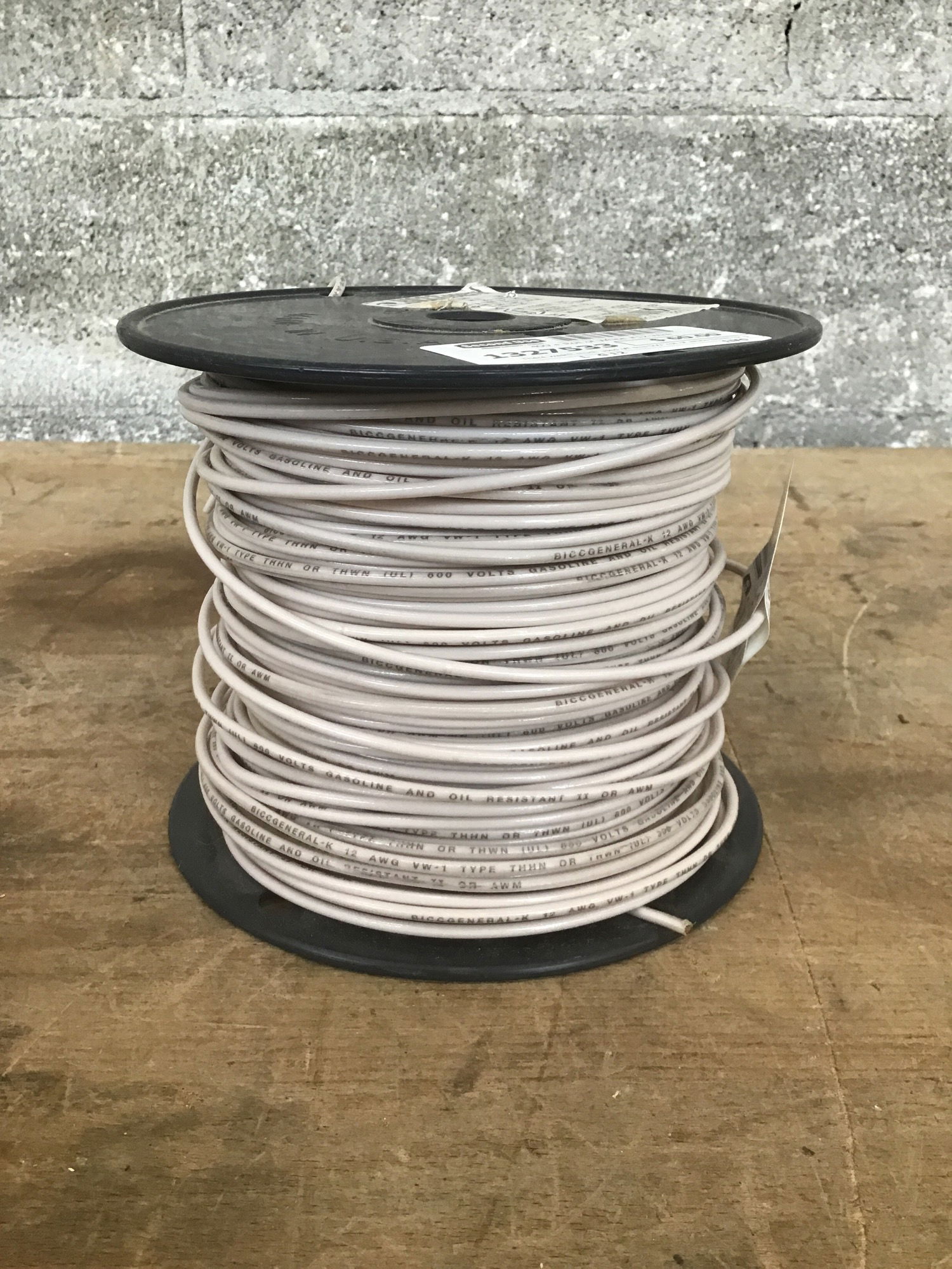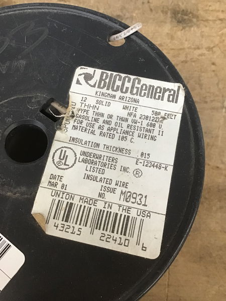 There wasn't much used off this 500' roll of white THHN 12 gauge solid (not strand) wire before it came to us. Should be well over 400' left. A full 500' roll sells for $128 @ HD.