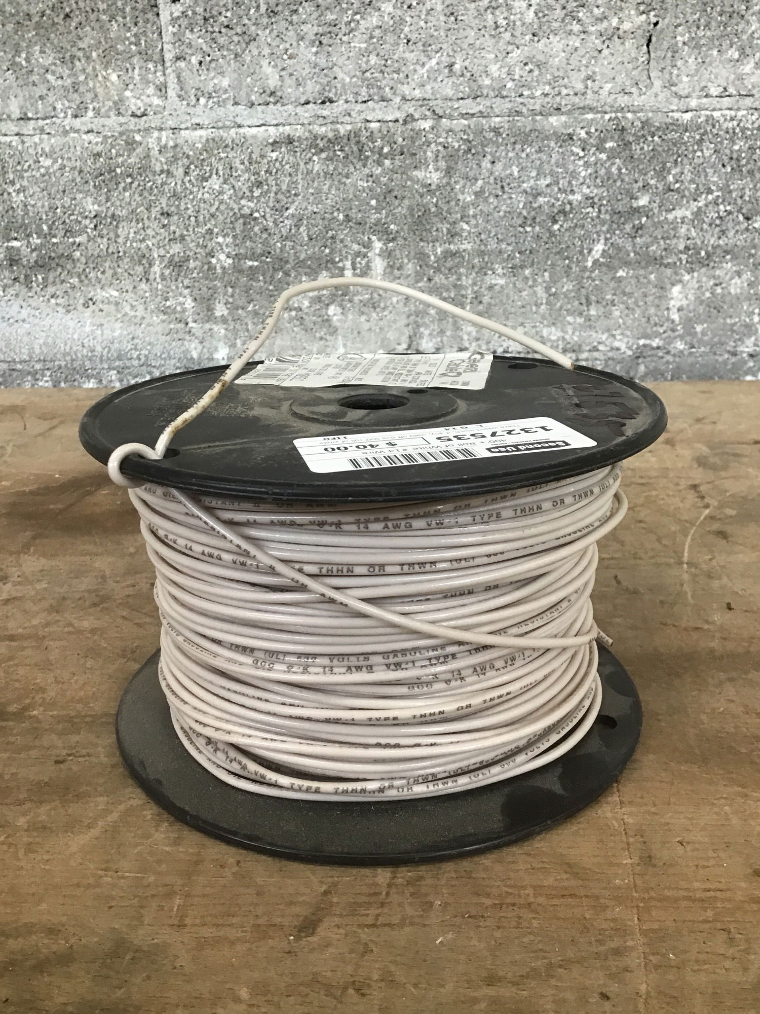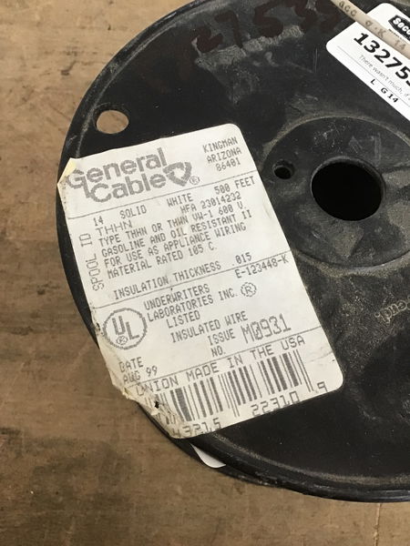 There wasn't much, if any, used off this 500' roll of white THHN 14 gauge solid (not strand) wire before it came to us. Should be well over 400' left. A full roll is $81 @ HD