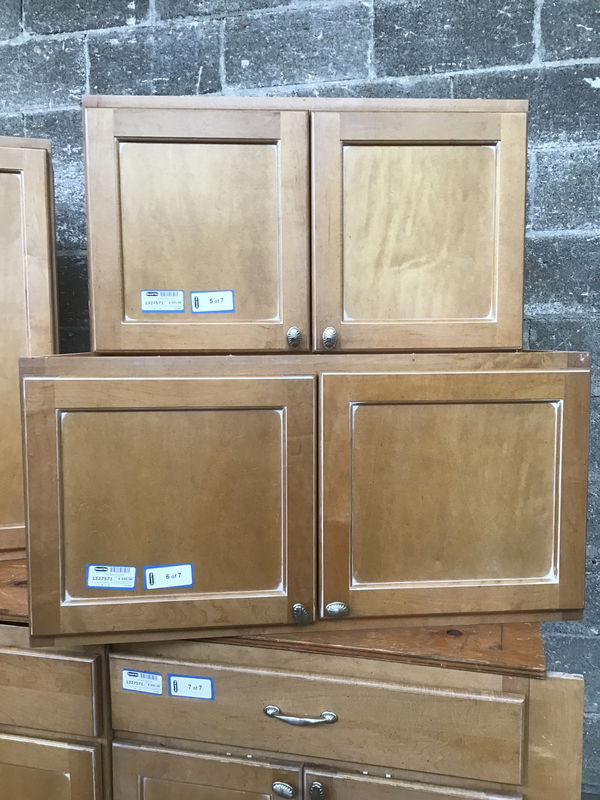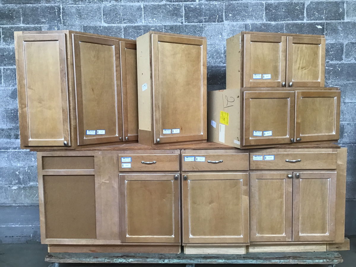 Nice quality maple-front cabinet set with particleboard boxes and solid maple faces and drawers. Comprised of 4 uppers and 3 lowers. Light, rich stain with flyspeck detail. Dovetail drawer construction, and this set features some additional solid pull-out drawers and a butcherblock cutting board that hides away nicely when not in use. Each has seashell-like brushed nickel hardware. Includes an angled corner upper and a blind corner lower.
