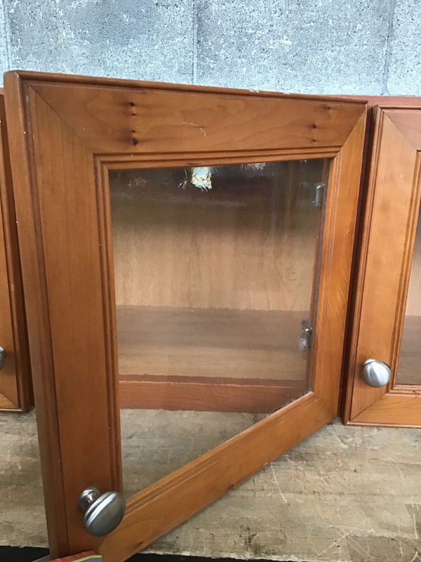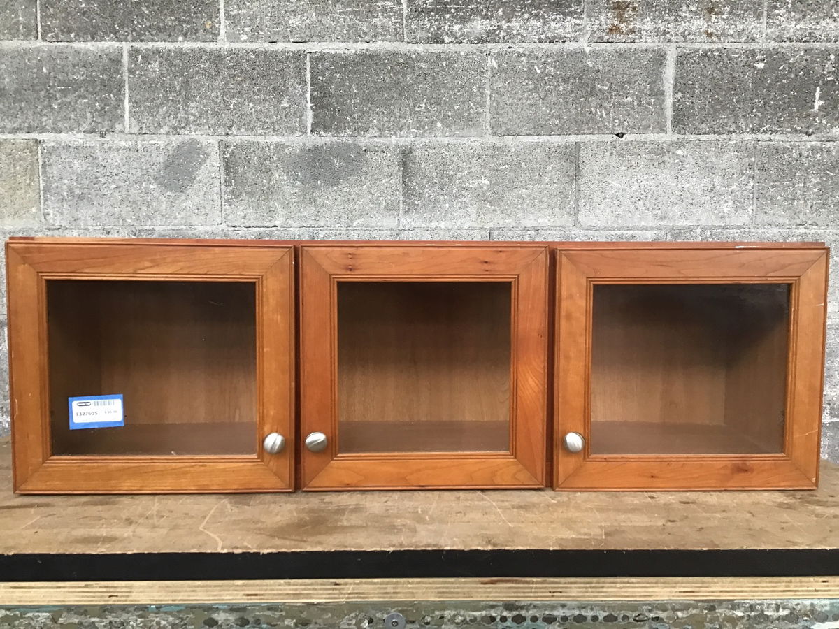 Cherry wall cabinet with three wavy glass doors.