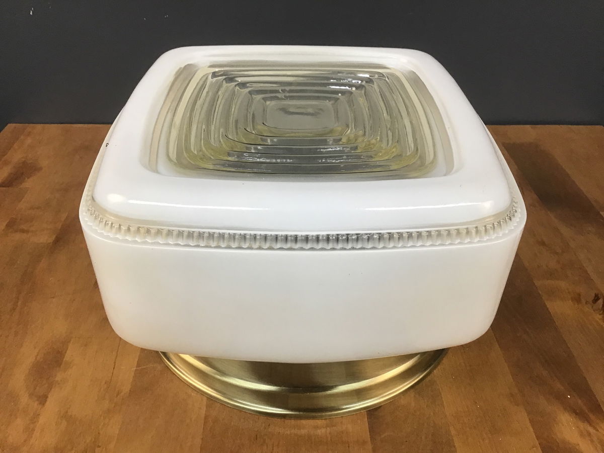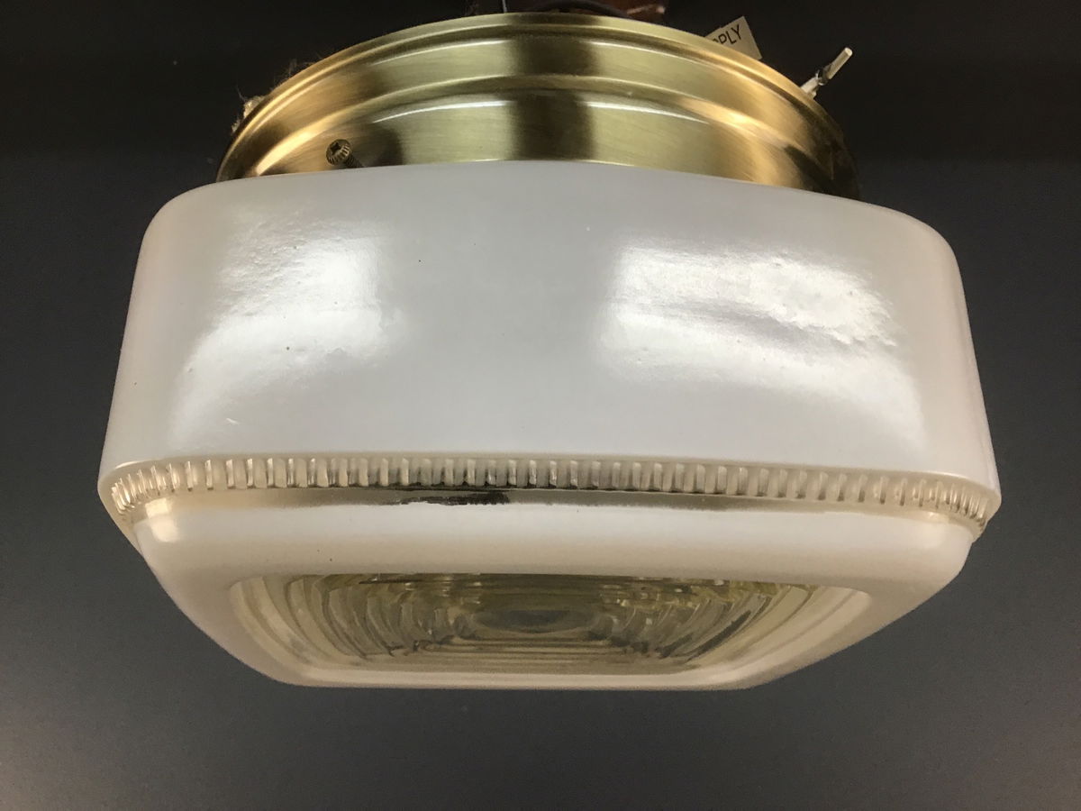 This glass ceiling light includes a more modern antique brass base and 1950s glass shade. The lightshop has put the components together in-house from our collection of parts.