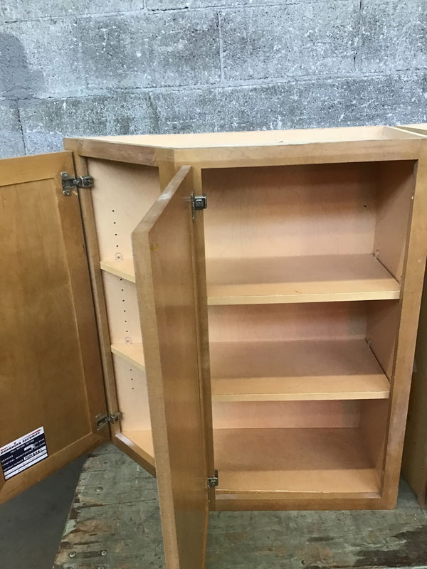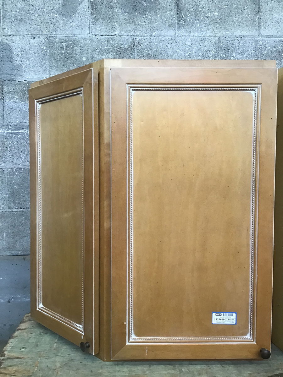 Maple-front corner upper cab with light finish and flyspeck. Has a little rope detail around the edge of the panels on the doors. Laminate is starting to peel a bit inside, price reflects.