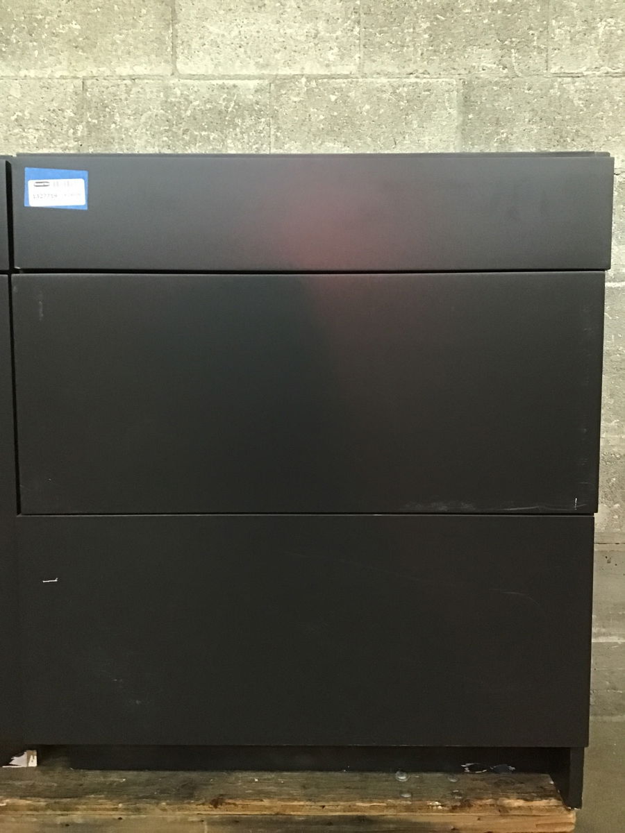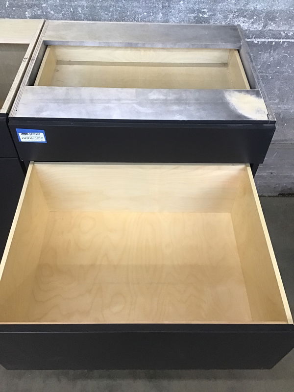 Nicely made and never installed flush face pots and pans base with full extension, soft close glides. Built with a 3/4" thick plywood cabinet box.