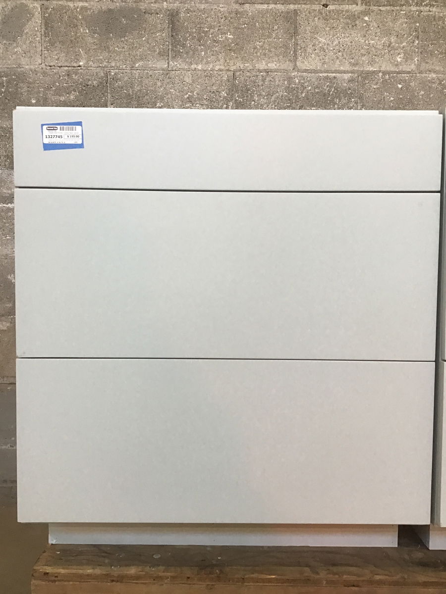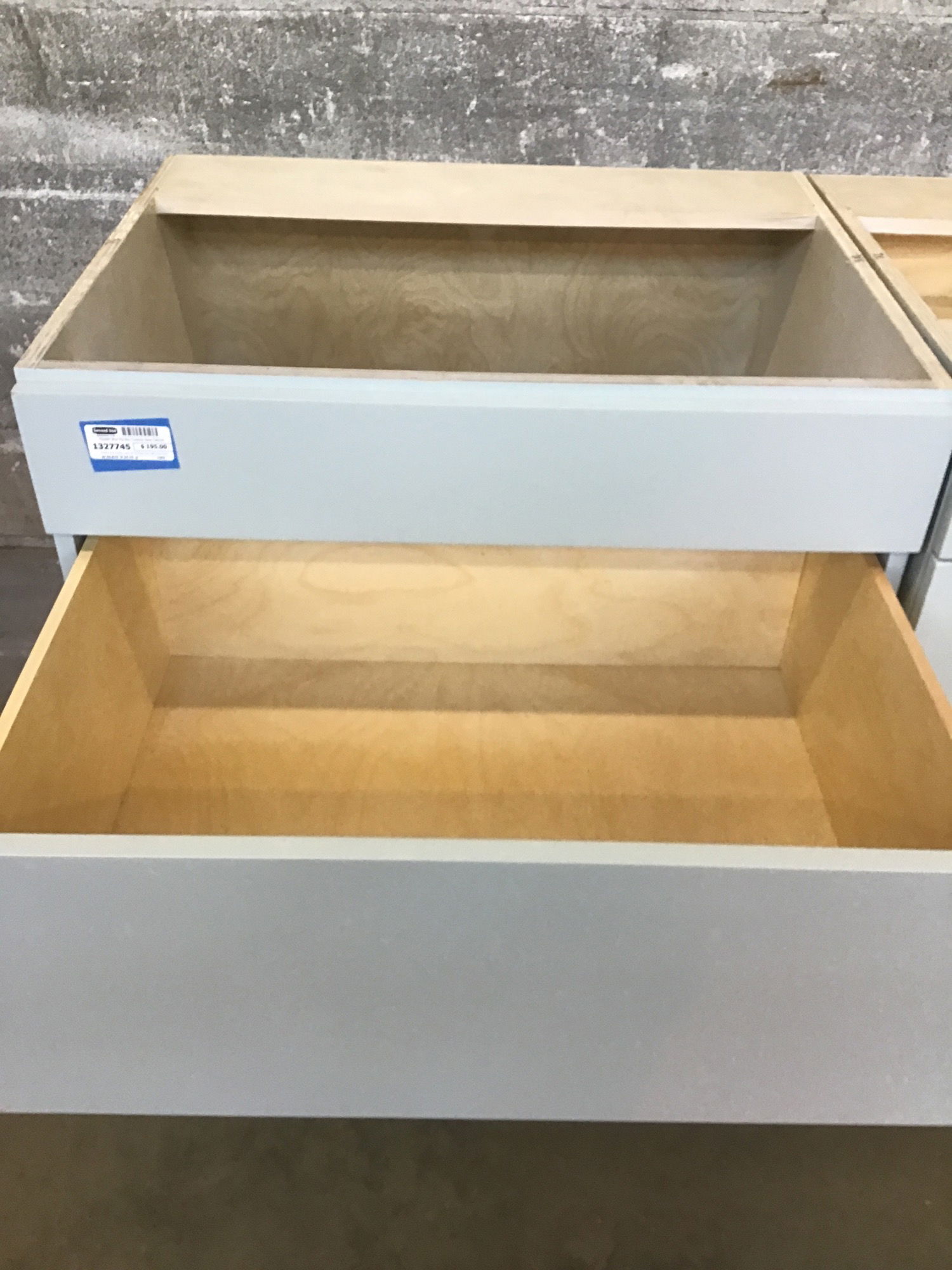 Powder blue factory paint job on flush face, soft close drawers. Cabinet box is 3/4" finish grade plywood. The top "drawer" has no drawer box, which I believe means it was intended for use with a cooktop installed in it.