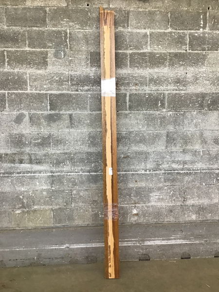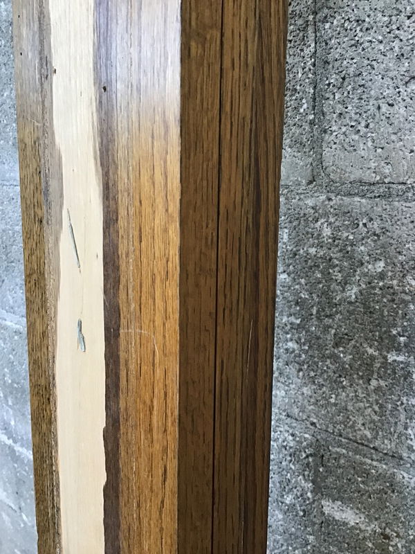Reclaimed denailed oak 1x6 with a dark stain on three sides. All three are 96"+, but less than 9'.