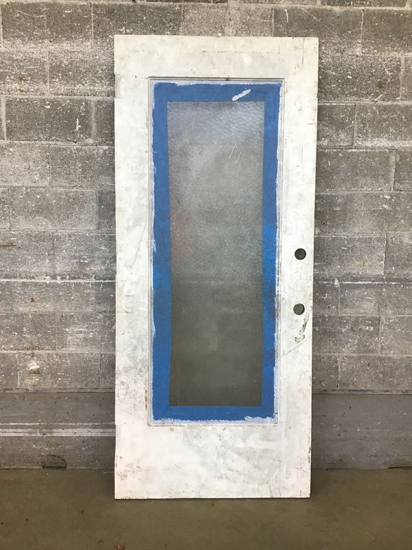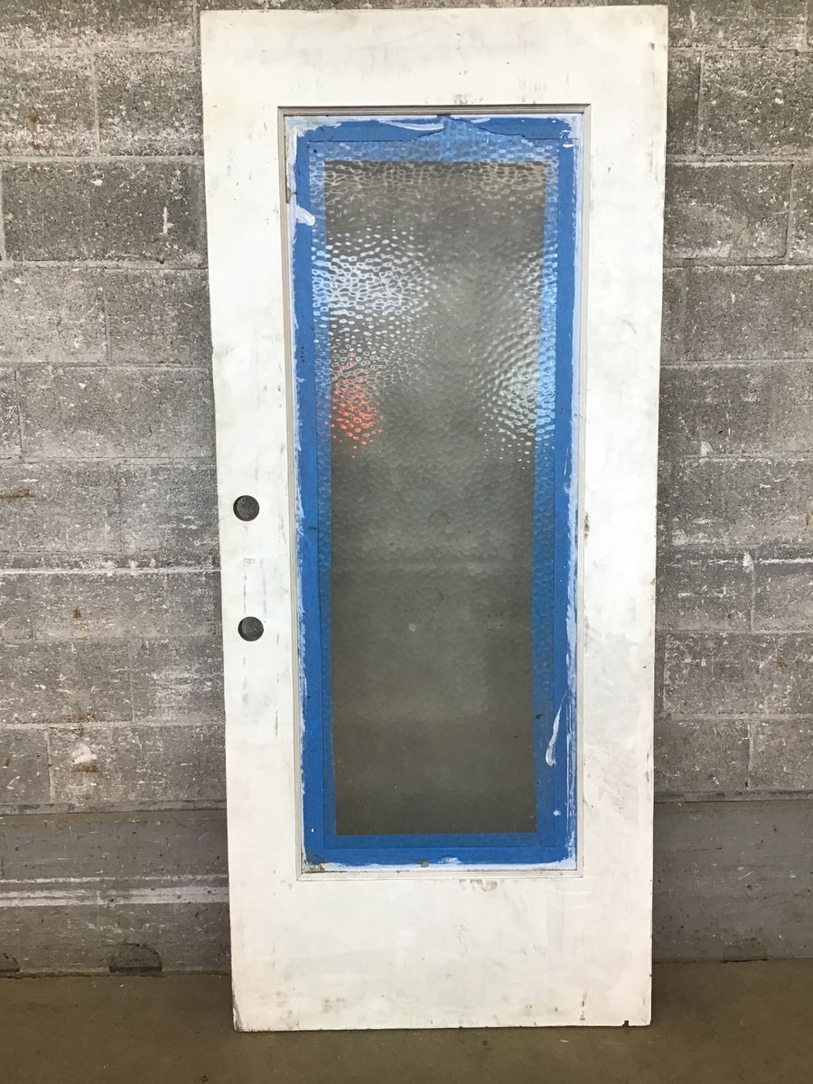 Vintage full lite door with a single pane of obscured, textured glass. Still structurally sound and, with its 13" tall bottom rail, room to cut down if you need to shorten it a little.