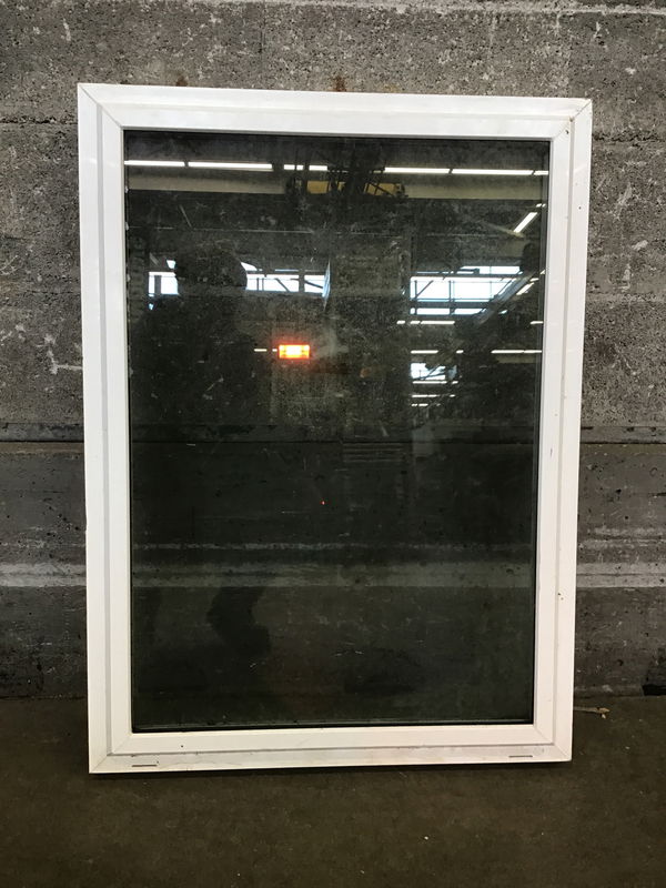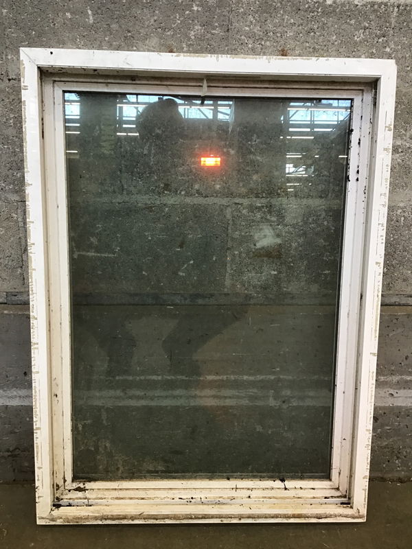 Tired looking fixed white vinyl window, but seals seem o.k. Price reflects condition.