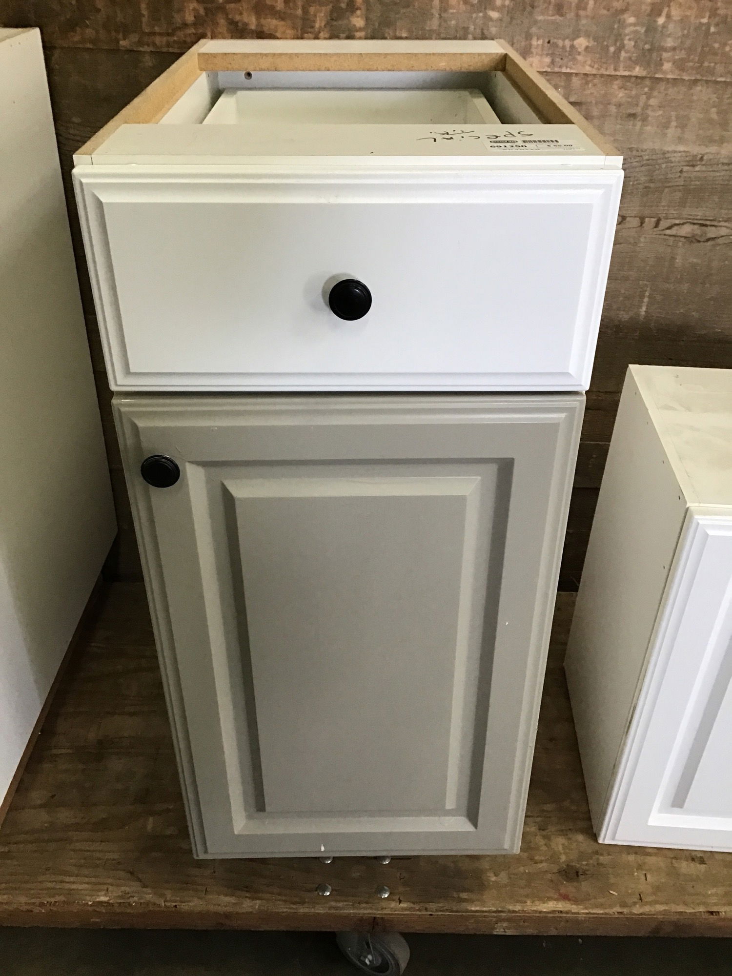 White kitchen base cabinet in good, used condition. Comes with a door and one drawer. There are two pull out shelves. Has particle board box and comes with black hardware. There is some cosmetic damage here and there but overall this is a pretty solid sturdy cabinet. A great option to paint as well so it can match the vibe of your kitchen. The door has already been painted a different color.