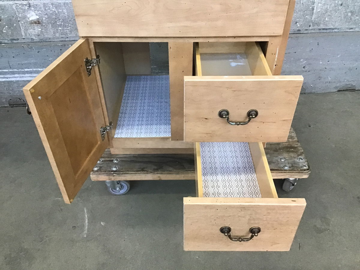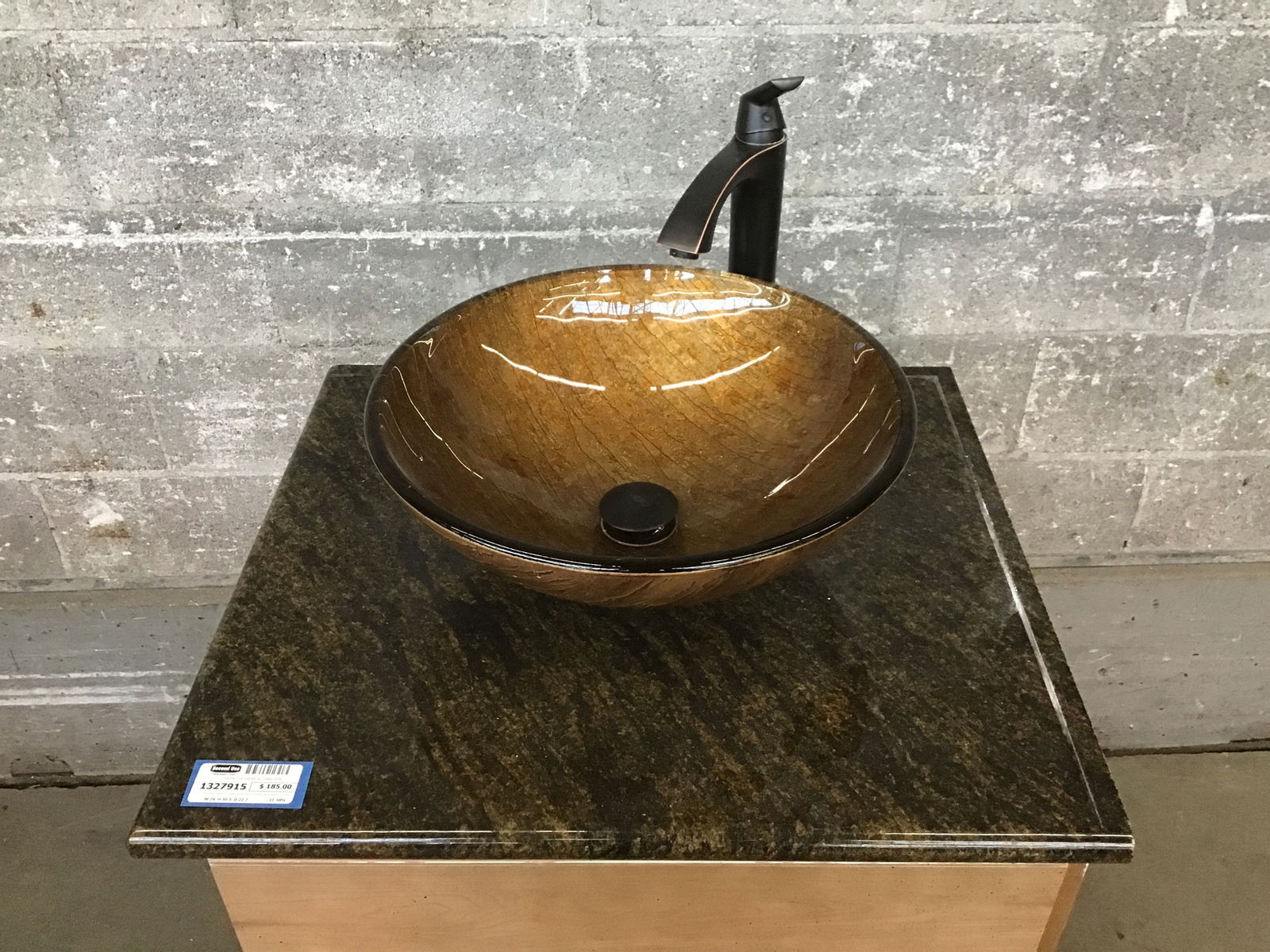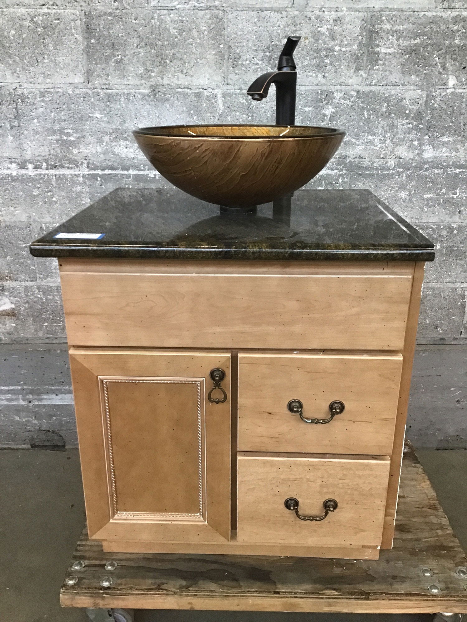 Smaller Canyon Creek vanity with a lovely dark stone counter and a glass vessel sink with a metallic, textured look to it. Solid maple faces with a light finish and flyspeck. Drawers are full-extension and soft-close with dovetail joinery. Already has a nice faucet mounted on it, so this guy is ready to go! Counter has a bullnose finish on front and left edges, seems it was previously installed in a corner. Height listed is just for the vanity box with counter, the highest point on the sink reaches 36.5."