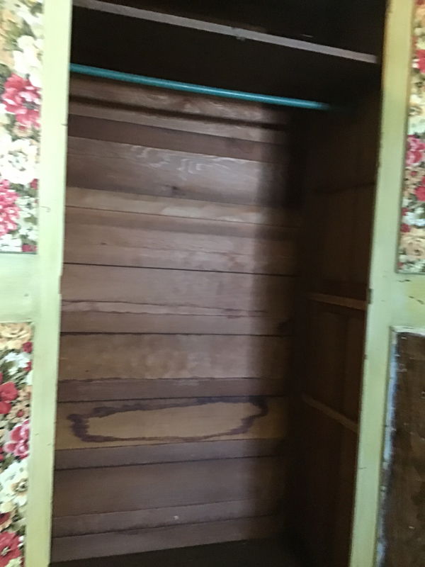 Holy freakin hutch! This is a gorgeous old school vintage hutch, painted a light green and with a shelf near the top on the inside and a rack to hang any of your things that need some hangin', and it also has some nice floral prints on the inside of the doors. It's definitely well worn and needs some work done as the panels on some parts of the back are loose, some paint is chipped and there's a scuff on the front right door. Still it looks great and could be your own piece of history!