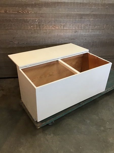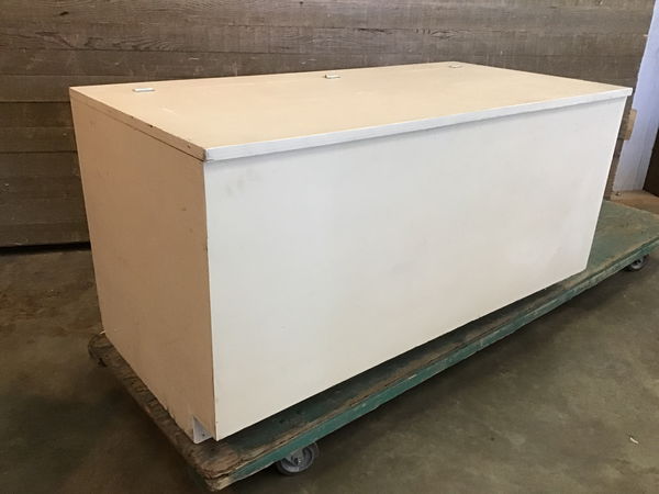 Big ol' storage chest with a thick plywood box and lid. This hinges from the top and is painted white. This would be great in a shop or art studio as storage for tools and materials. Throw a big ol' cushion on it and you'll have a nice place to sit in your work space.