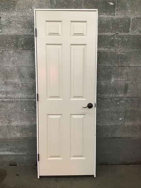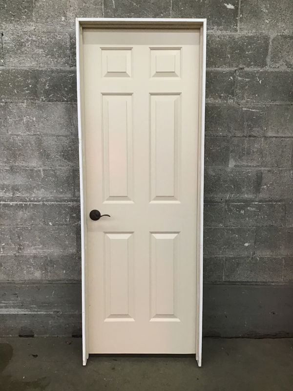 Hollow core faux-panelled pre-hung interior door, in good condition with oiled bronze hardware already attached.
