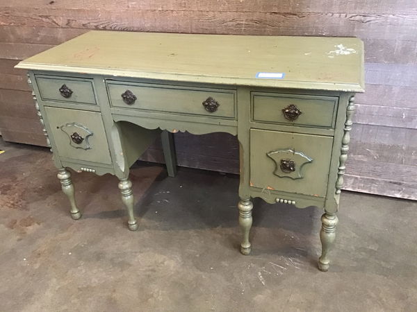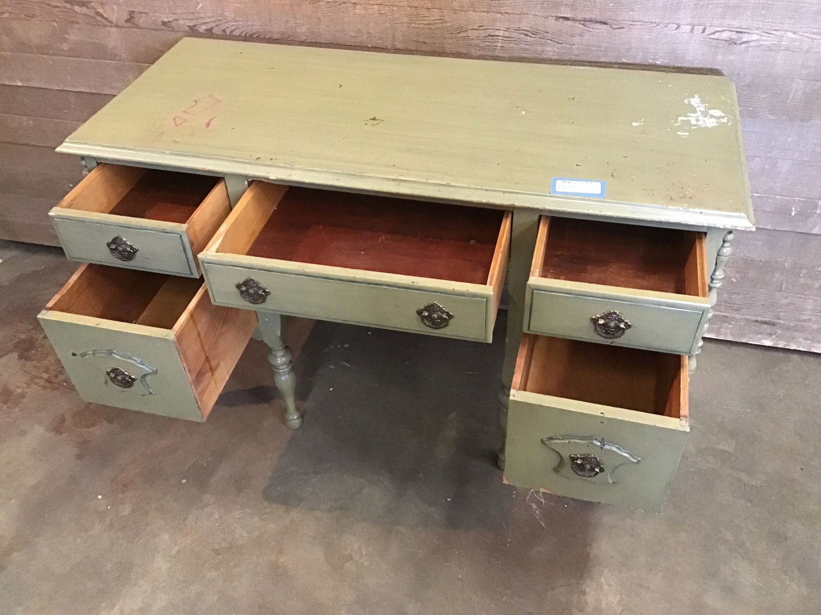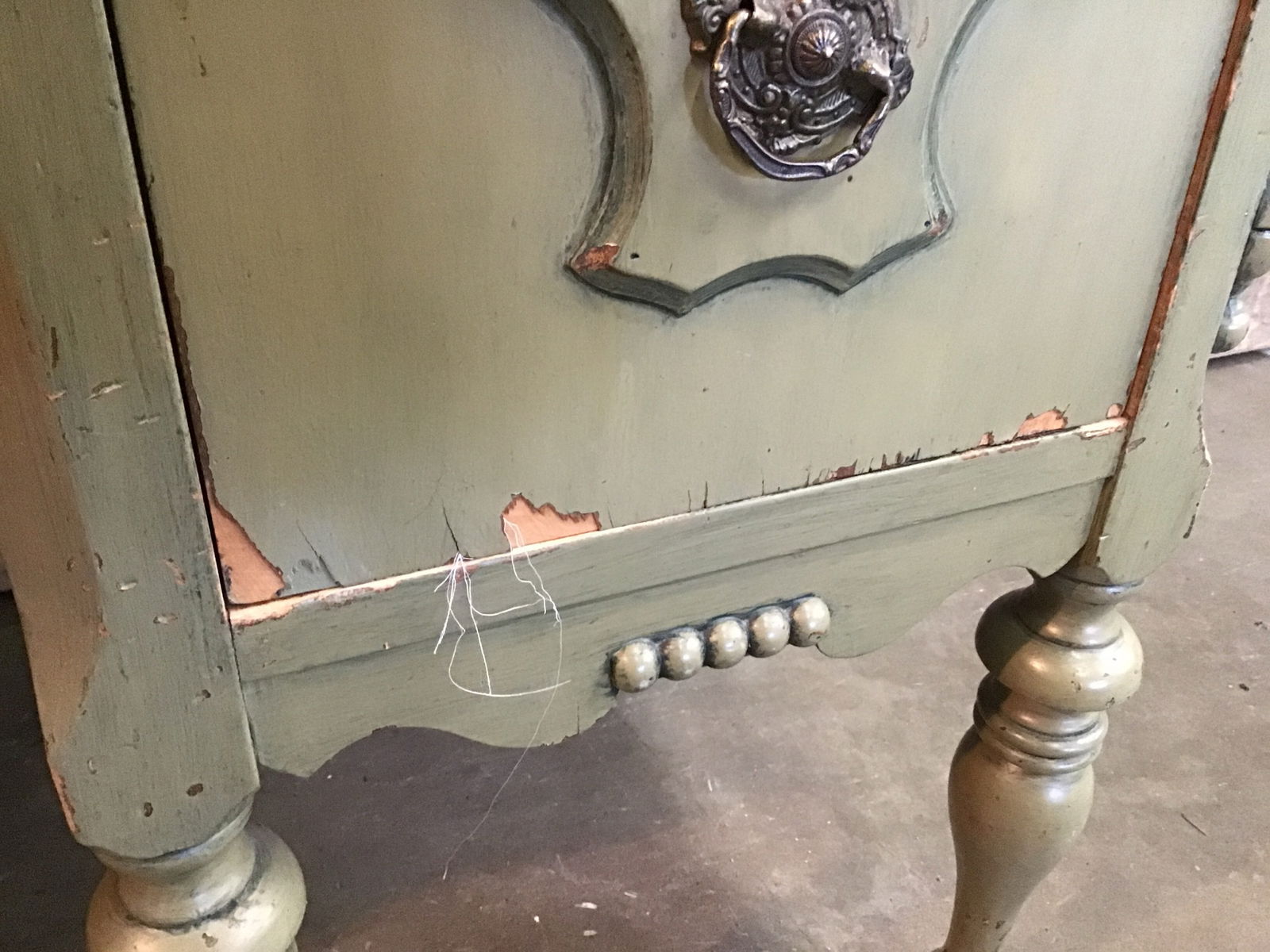 This piece has some peeling veneer and some staining to the top but would clean up nice with a new paint job. 5 drawers and 8 legs. Nice details.