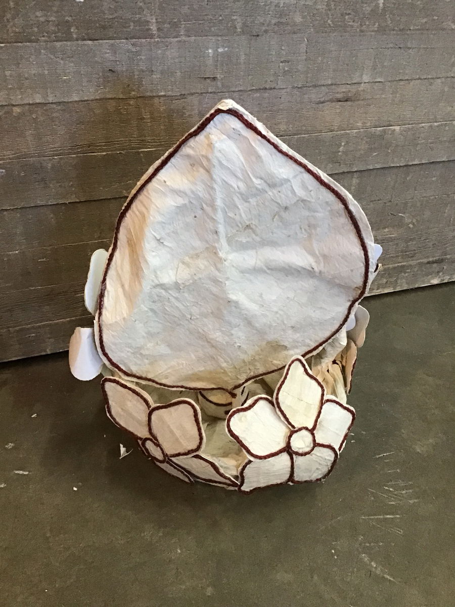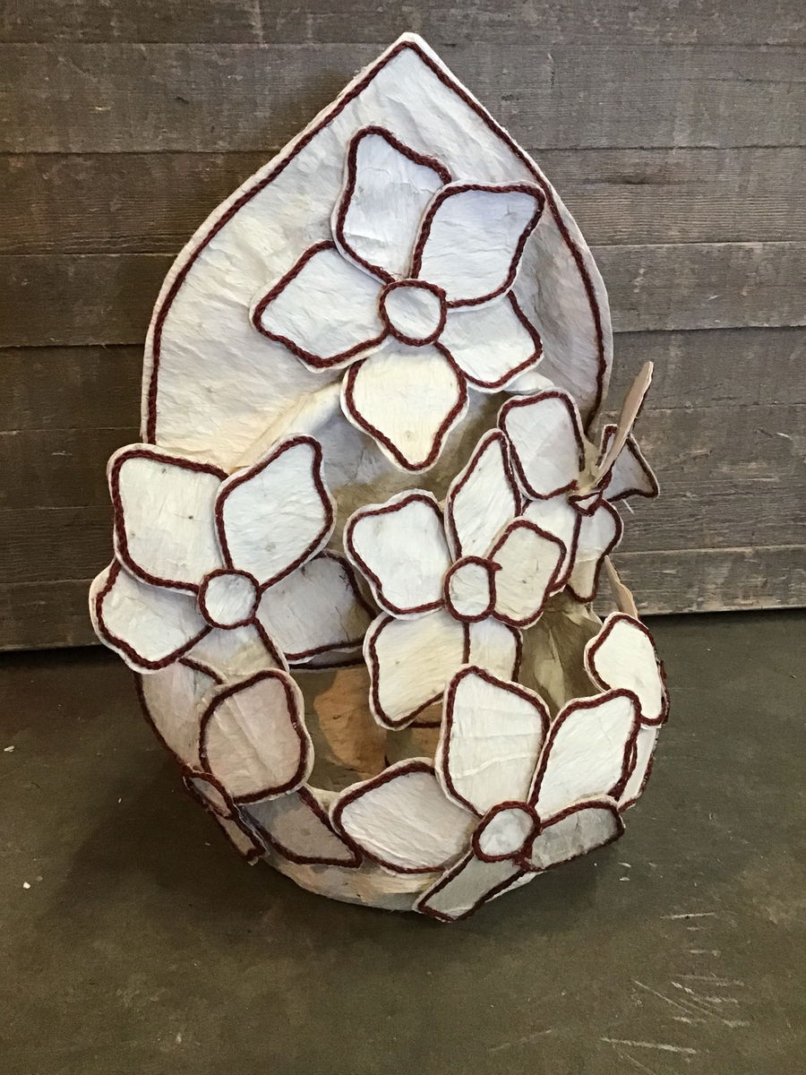 Cool DIY'ed flower basket. Looks to be made with a rough fabric and pretty red rope to outline the shapes. Could possibly be used as a flower planter, or as storage for teddy bears or dolls.