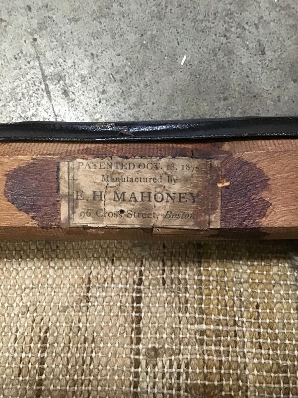 Pretty sweet antique chair with a woven tapestry seat by E.H. Mahoney and was patented in 1876. The seat shows some heavy signs of wear though it's still holding up with no tears. There is a decorative wood piece with a damage veneer as well. The overall frame is in good sturdy condition though and this would be a great decorative piece for any antique furniture lovers, and could be a good project to refinish for more experienced furniture workers.